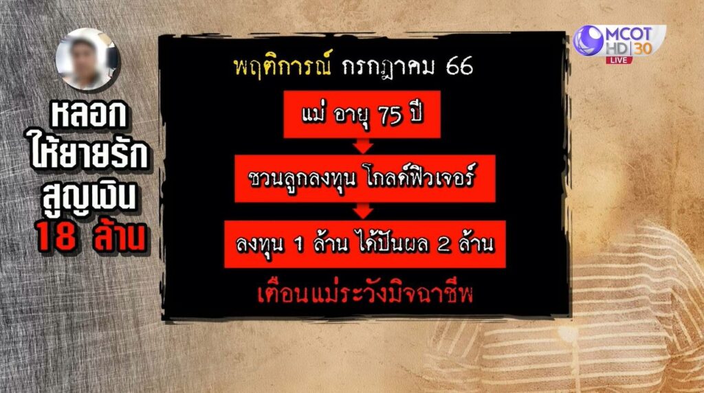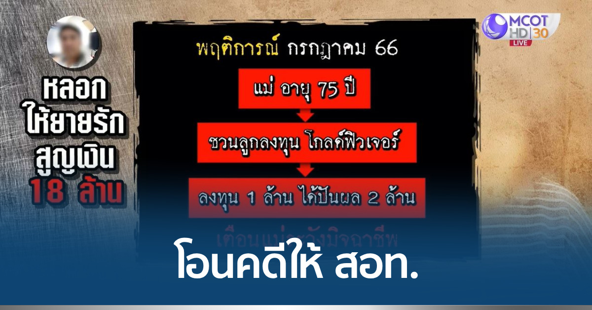 ความคืบหน้าคดีหญิงวัย 75 ปี ถูกหลอกให้รักสูญ 18 ล้านบาท ล่าสุดลูกชาย เปิดเผยกับทีมข่าวสำนักข่าวไทย ว่าหลังจากเมื่อที่ 9 ต.ค. ได้พามารดาเข้าแจ้งความกับตำรวจ สน.พหลโยธิน ให้ดำเนินการติดตามตัวคนร้ายที่หลอกลวงคุณแม่จนสูญเสียเงินเกือบ 20 ล้านบาท และเข้าให้ปากคำในวันที่ 10 ต.ค. ถึงความเป็นมา รวมถึงพฤติการณ์คนร้าย ตลอดจนรวบรวมข้อมูล การโอนเงินไปยังบัญชีของกลุ่มคนร้ายอย่างละเอียด