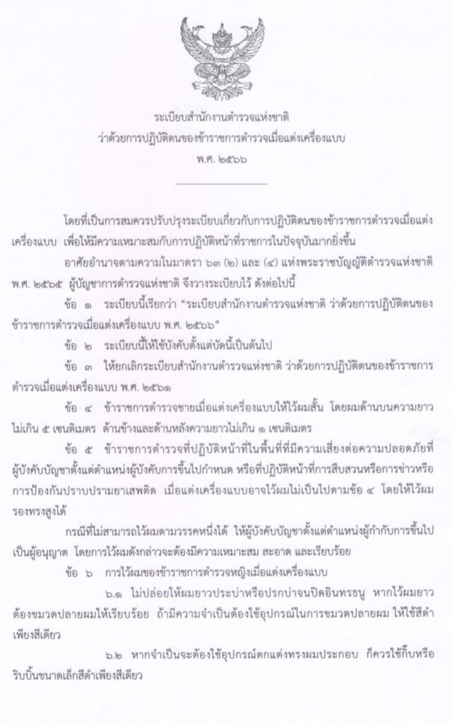 ข้อ 6 การไว้ผมของข้าราชการตำรวจหญิงเมื่อแต่งเครื่องแบบ