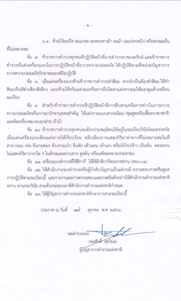 พล.ต.อ.ต่อศักดิ์ สุขวิมล ผู้บัญชาการตำรวจแห่งชาติ (ผบ.ตร.) ลงนามในระเบียบสำนักงานตำรวจแห่งชาติว่าด้วยการปฏิบัติตนของข้าราชการตำรวจเมื่อแต่งเครื่องแบบ พ.ศ.2566 โดยในระเบียบมีการระบุเหตุผลที่ประกาศใช้ เนื่องด้วยเห็นว่าเป็นการสมควรปรับปรุงระเบียบเกี่ยวกับการปฏิบัติตนของข้าราชการตำรวจเมื่อแต่งเครื่องแบบ เพื่อให้มีความเหมาะสมกับการปฏิบัติหน้าที่ราชการในปัจจุบันมากยิ่งขึ้นอาศัยอำนาจตามความในมาตรา 63 (2) และ (4) แห่งพระราชบัญญัติตำรวจแห่งชาติ พ.ศ.2565 มีใจความระบุว่า ระเบียบนี้เรียกว่า ‘ระเบียบสำนักงานตำรวจแห่งชาติ ว่าด้วยการปฏิบัติตนของข้าราชการตำรวจเมื่อแต่งเครื่องแบบ พ.ศ. 2566’ ระเบียบนี้ให้ใช้บังคับตั้งแต่บัดนี้เป็นต้นไป และให้ยกเลิกระเบียบสำนักงานตำรวจแห่งชาติ ว่าด้วยการปฏิบัติตนของข้าราชการตำรวจเมื่อแต่งเครื่องแบบ พ.ศ. 2561
