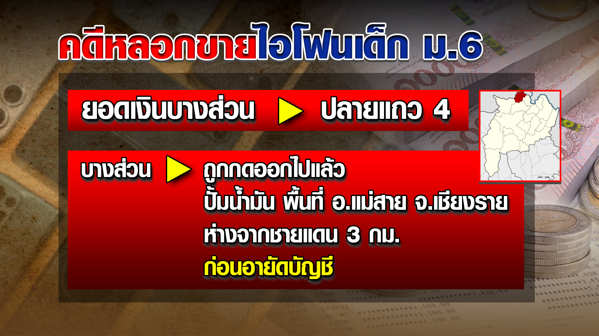 ทั้งนี้ ผู้บัญชาการตำรวจไซเบอร์ ยังบอกอีกว่า การสืบสวนทำให้พบว่า ขบวนการนี้เปิดบัญชีม้า 4 แถว โดยแถวแรกอยู่ที่ จ.ชัยภูมิ คือ น.ส.ดอกแก้ว ส่วนอีก 3 แถว อยู่ในพื้นที่ จ.เชียงราย ยืนยันเงินที่รับจากนักเรียนหญิง ม.6 ยังอยู่กับปลายแถวที่ 4 แต่บางส่วนถูกกดออกไปแล้ว บริเวณปั๊มน้ำมันแห่งหนึ่งใน อ.แม่สาย จ.เชียงราย ห่างจากชายแดนเพียง 3 กิโลเมตร ซึ่งตอนนี้ตำรวจอายัดบัญชีแล้ว. – สำนักข่าวไทย