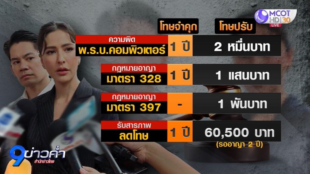 ทนายนิด้า บอกว่า พฤติการณ์ของจำเลยคือ การส่งต่อข้อมูลอนาจาร ไม่ได้เป็นผู้ตัดต่อคลิปอนาจารขึ้นมาเอง การกระทำนี้ถือว่ามีความผิด โดยศาลพิพากษาว่าจำเลยผิดตาม พ.ร.บ.คอมพิวเตอร์ มาตรา 14(4)(5) ลงโทษจำคุก 1 ปี และปรับ 20,000 บาท ผิดประมวลกฎหมายอาญา มาตรา 328 ลงโทษจำคุก 1 ปี ปรับ 100,000 บาท และมาตรา 397 ลงโทษปรับ 1,000 บาท รวมโทษจำคุก 2 ปี ปรับ 121,000 บาท แต่จำเลยให้การรับสารภาพ ลดโทษกึ่งหนึ่ง คงเหลือจำคุก 12 เดือน และปรับ 60,500 บาท โทษจำคุกให้รอลงอาญาไว้ 2 ปี และให้รายงานตัวพนักงานคุมประพฤติ 4 ครั้งใน 1 ปี ทำงานบริการสังคม 24 ชั่วโมง นอกจากนี้ ศาลยังสั่งให้จำเลยลบ ทำลาย ข้อความอันเป็นการหมิ่นประมาทโจทก์ และให้โฆษณาคำพิพากษาในหนังสือพิมพ์ 15 วัน และโฆษณาคำขออภัยผ่านทางเฟซบุ๊กของโจทก์เป็นเวลา 30 วัน ให้จำเลยชดใช้ค่าสินไหมทดแทน 100,000 บาท พร้อมดอกเบี้ยตามกฎหมาย .-สำนักข่าวไทย