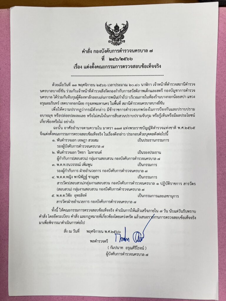 เพื่อให้ความปรากฏว่ากรณีดังกล่าว มีข้าราชการตำรวจบกพร่องในการป้องกันและปราบปรามอบายมุข หรือปล่อยปละละเลย หรือไม่สนใจในการสืบสวนปราบปรามจับกุม หรือรู้เห็นหรือมีผลประโยชน์เกี่ยวข้องหรือไม่ จึงแต่งตั้ง พ.ต.อ.เจษฎา สวยสม รอง ผบก.น.7 เป็นประธานคณะกรรม พ.ต.อ.วิทยา โมทายนต์ ผกก.(สอบสวน) กลุ่มงานสอบสวน บก.น.7 รองประธานคณะกรรมการ พ.ต.ท.ธนวรรธณ์ เพิ่มพูน รองผกก.ฝอ.บก.น.7 คณะกรรมการ พ.ต.ต.หญิง พานิพัฏฐ์ ชาญสุข สว.(สอบสวน) กลุ่มงานสอบสวน บก.น.1 ปฏิบัติราชการ สว.(สอบสวน) กลุ่มงานสอบสวน บก.น.7 คณะกรรมการ พ.ต.ต.วิชัย อุทธสิงห์ สว.ฝอ.บก.น.7 คณะกรรมการและเลขานุการ ทั้งนี้ ให้คณะกรรมการตรวจสอบข้อเท็จจริง ดำเนินการให้แล้วเสร็จภายใน 7 วัน นับแต่วันรับทราบ คำสั่ง โดยยืดระเบียบ คำสั่ง และกฎหมายที่เกี่ยวข้องโดยเคร่งครัด แล้วเสนอราซงานการตรวจสอบข้อเท็จจริงมาเพื่อพิจารณาดำเนินการต่อไป