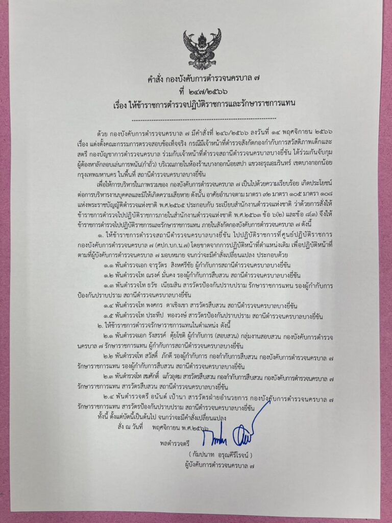 นอกจากนี้ พล.ต.ต.กัมปนาท ได้ลงนามคำสั่งคำสั่ง บก.น.7 ที่ 247/2566 เรื่อง ให้ข้าราชการตำรวจปฏิบัติราชการและรักษาราชการแทนโดย ๑. ให้ข้าราชการตำรวจสถานีตำรวจนครบาลบางยี่ชัน ไปปฏิบัติราชการที่ศูนย์ปฏิบัติราชการกองบังคับการตำรวจนครบาล 7 (ศปก.บก.น.7) โดยขาดจากการปฏิบัติหน้าที่ตำแหน่งเดิม เพื่อปฏิบัติหน้าที่ตามที่ ผบก.น. 7 มอบหมาย จนกว่าจะมีคำสั่งเปลี่ยนแปลง ประกอบด้วย พ.ต.อ.จารุวัตร สิงหศรีชัย ผกก.สน.บางยี่ขัน พ.ต.ท.ณรงค์ มั่นคง รองผกก.สส.สน.บางยี่ขันพ.ต.ท.ธวัช เนียมสิน สวป.สน.บางยี่ขัน รักษาราชการแทน รองผกก.ป.สน.บางยี่ขัน พ.ต.ท.พงศกร ดาเชิงเขา สว.สส.สน.บางยี่ขัน พ.ต.ท.ประทีป ทองวงษ์ สารวัตรป้องกันปราบปราม สถานีตำรวจนครบาลบางยี่ชัน