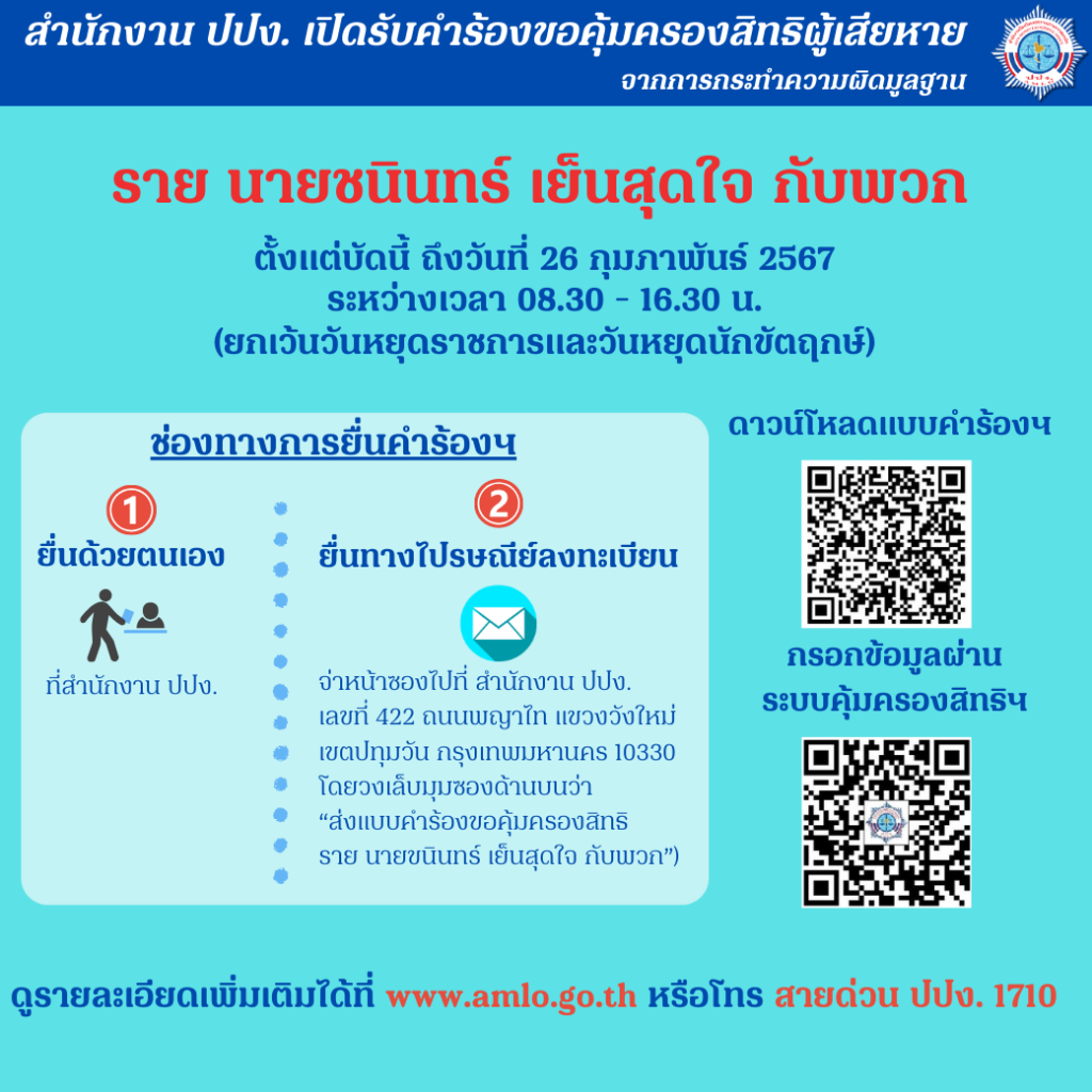 สำนักงาน ปปง. เปิดรับคำร้องขอคุ้มครองสิทธิผู้เสียหายจากการกระทำความผิดมูลฐาน ตามพระราชบัญญัติป้องกันและปราบปรามการฟอกเงิน พ.ศ. 2542 ซึ่งแก้ไขเพิ่มเติมโดยพระราชบัญญัติป้องกันและปราบปรามการฟอกเงิน (ฉบับที่ 6) พ.ศ. 2565 ในรายคดีดังกล่าว ตั้งแต่บัดนี้ถึง 26 ก.พ.67 โดยผู้เสียหายสามารถยื่นคำร้องพร้อมหลักฐานแสดงรายละเอียดแห่งความเสียหายและจำนวนความเสียหายที่ได้รับต่อพนักงานเจ้าหน้าที่ได้ 2 ช่องทาง ยื่นด้วยตนเอง ณ สำนักงาน ปปง. โดยผู้เสียหายต้องนำแบบคำร้องฯ ที่กรอกข้อมูลครบถ้วนและแนบเอกสารที่เกี่ยวข้องทุกฉบับมาด้วยหรือยื่นทางไปรษณีย์ลงทะเบียน โดยจ่าหน้าซองมาที่ สำนักงาน ปปง. เลขที่ 422 ถนนพญาไท แขวงวังใหม่ เขตปทุมวัน กรุงเทพฯ 10330 โดยวงเล็บมุมซองด้านบนว่า “(ส่งแบบคำร้องขอคุ้มครองสิทธิคดีรายนายชนินทร์ เย็นสุดใจ กับพวก)”