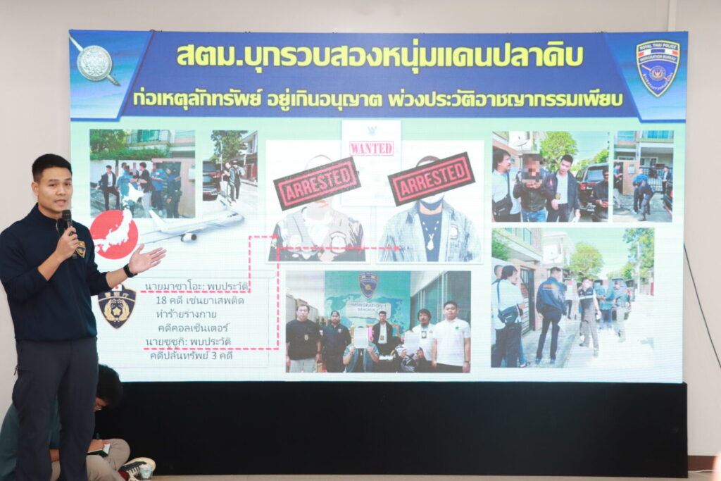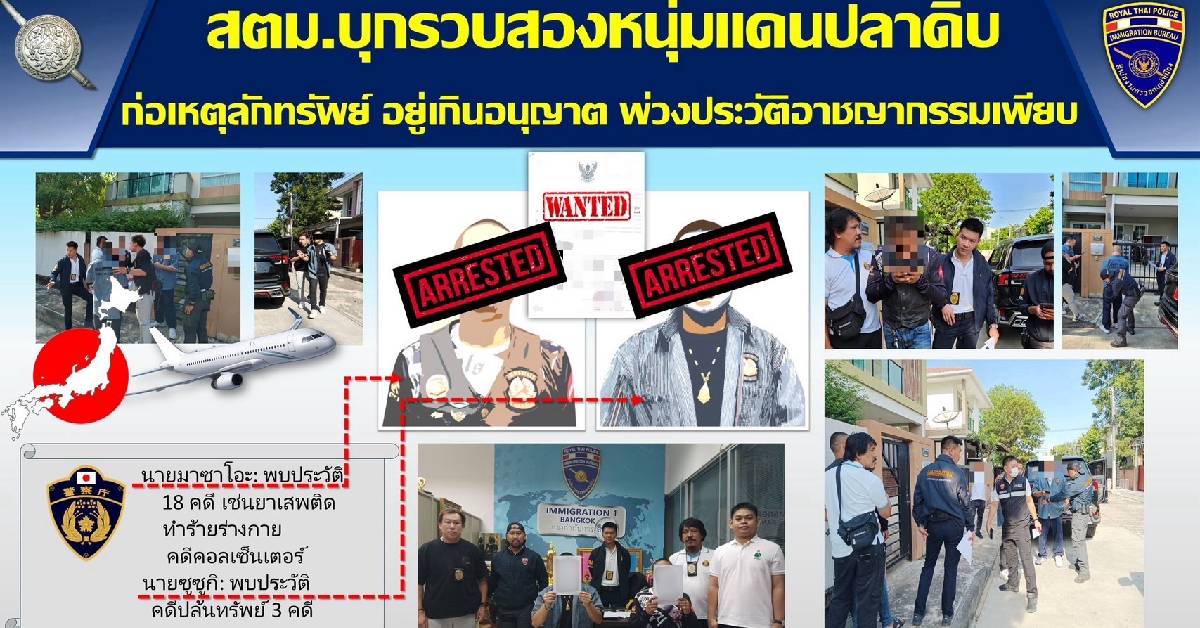 นายมาซาโอะ (นามสมมติ) อายุ 36 ปี สัญชาติญี่ปุ่น ถูกตำรวจ ตม.จับกุมในความผิดฐานลักทรัพย์ในเวลากลางคืน และจับกุมนายซูซูกิ (นามสมมติ) อายุ 24 ปี สัญชาติญี่ปุ่น ในความผิดฐาน เป็นบุคคลต่างด้าวอยู่ในราชอาณาจักรโดยการอนุญาตสิ้นสุด โดยผู้ต้องหาทั้งสอง ถือเป็นบุคคลต่างด้าวที่มีพฤติกรรมเป็นภัยสังคม มีประวัติการก่ออาชญากรรม หรือมีส่วนพัวพันกับองค์กรอาชญากรรมข้ามชาติ