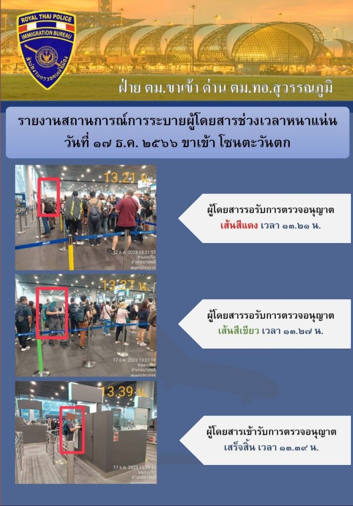 พล.ต.ต.เชิงรณ กล่าวอีกว่า ในช่วงเที่ยวบินลงที่สุวรรณภูมิพร้อมกัน บางชั่วโมงสูงถึง 25 เที่ยวบิน จะมีคลื่นผู้โดยสารขนาดใหญ่โถมเข้าที่โถง ตม. ซึ่งอาจมีภาพการสะสมของผู้โดยสาร ซึ่งทาง ตม.ได้มีมาตรการเร่งระบาย โดยใช้เวลาตรวจคัดกรองกว่า 7 ขั้นตอนตามมาตรฐานความมั่นคง ทันทีที่ยื่นพาสปอร์ตให้ จนท.ใช้เวลาไม่เกินคนละ 45 วินาที เท่านั้น นอกจากนั้น ยังมีการทดลองจับเวลาผู้โดยสารที่เดินเข้าโถง รอคิว และรับการตรวจต่อคน พบว่า ใช้เวลารอเข้ารับการตรวจราว 18-20นาที ซึ่งทาง ตม.จำเป็นต้องคัดกรองคนร้ายชาวต่างชาติที่อาจแฝงตัวเป็นนักท่องเที่ยวมาด้วยเช่นกัน