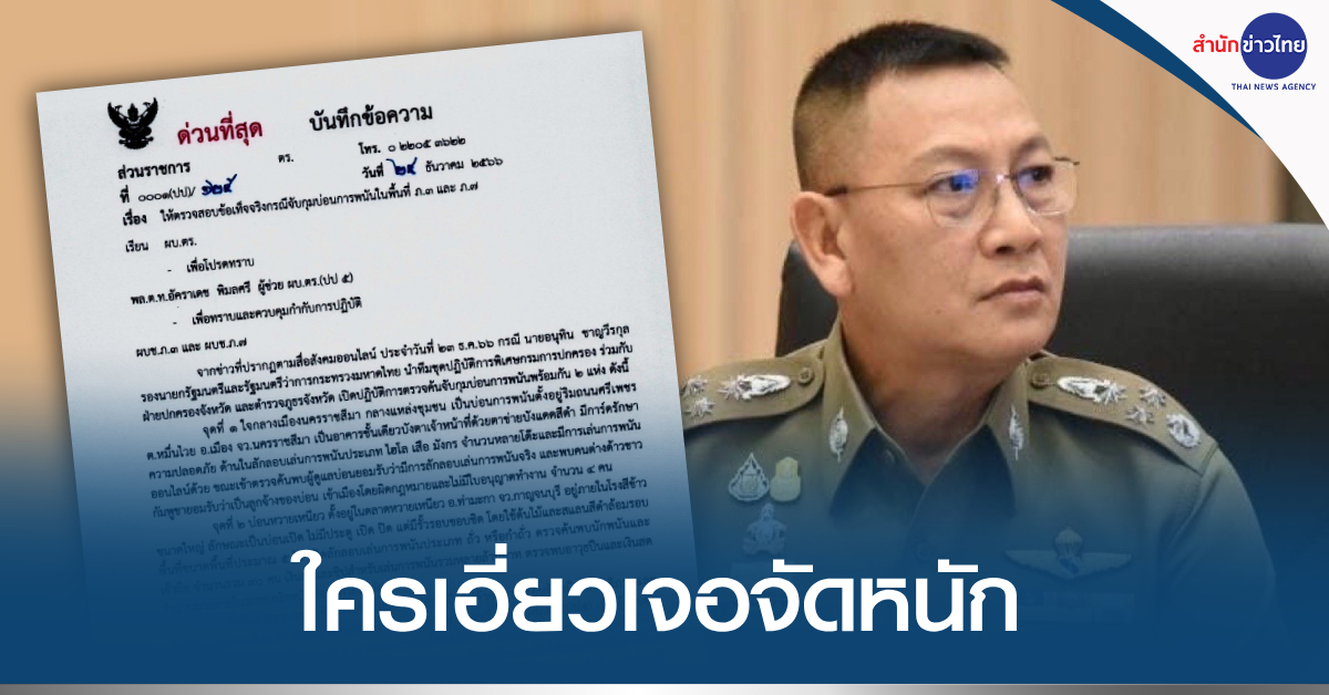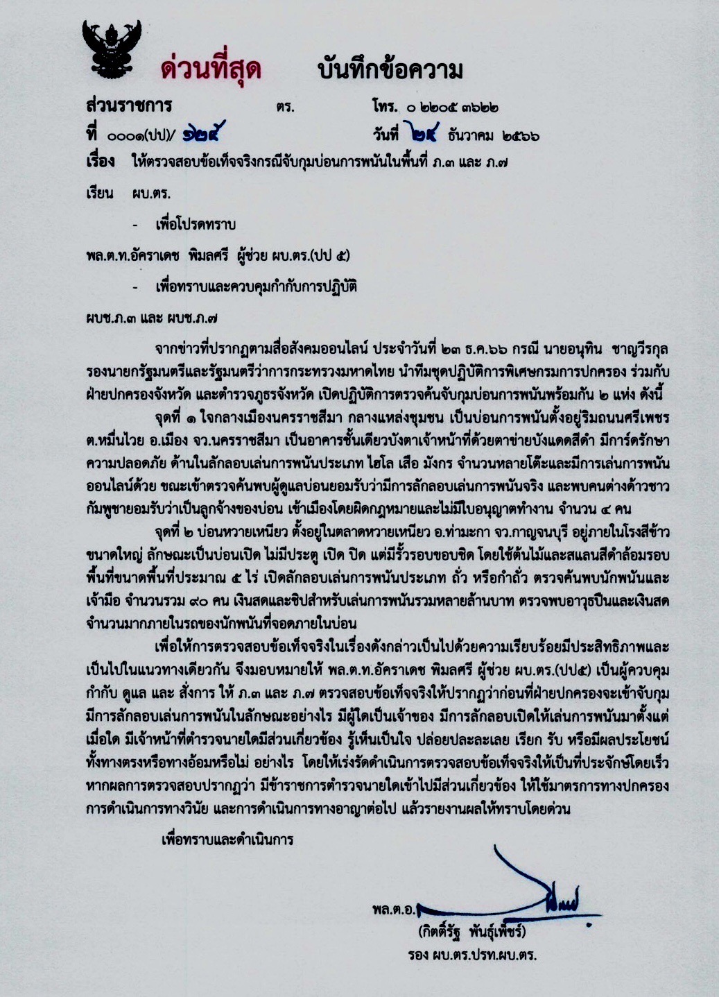 เมื่ิอวันที่ 24 ธันวาคม 2566 ที่สำนักงานตำรวจแห่งชาติ (ตร.) พล.ต.อ.กิตติ์รัฐ พันธุ์เพ็ชร์ รอง ผบ.ตร. ปฏิบัติราชการแทน ผบ.ตร. มีหนังสือคำสั่งบันทึกด่วนที่สุดถึง พล.ต.ท.อัคราเดช พิมลศรี ผู้ช่วย ผบ.ตร.(ปป 5) มีใจความระบุว่า เรื่องให้ตรวจสอบข้อเท็จจริงกรณีจับกุมบ่อนการพนันในพื้นที่ ภ.3 และ ภ.7 เพื่อทราบและควบคุมกำกับการปฏิบัติ ผบช.ภ.3 และ ผบช.ภ.7