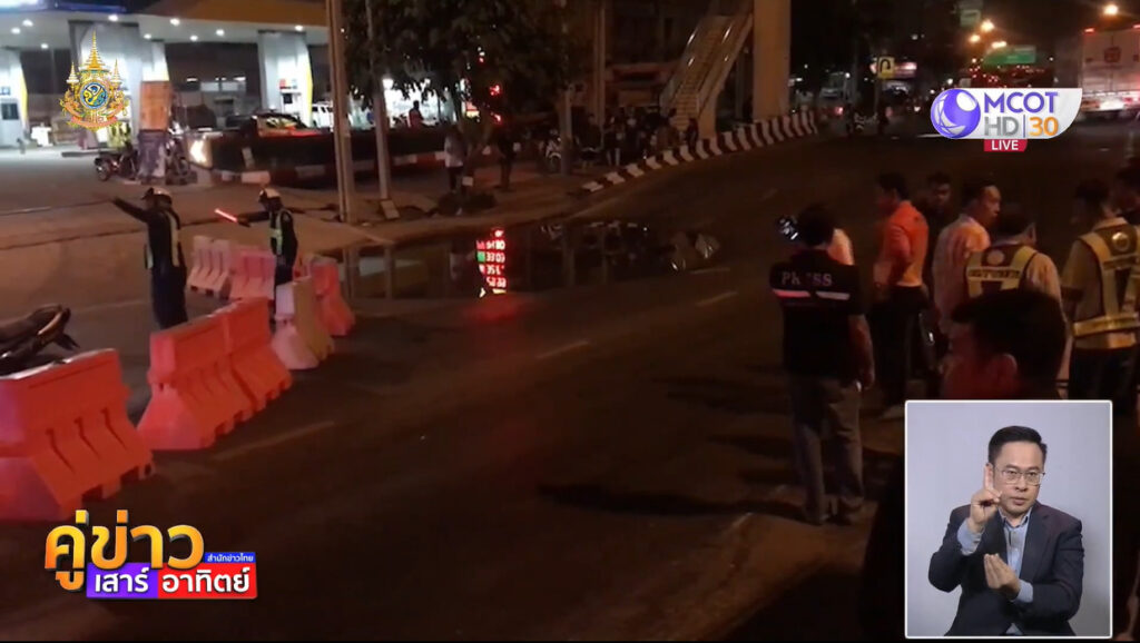สำหรับจุดที่ถนนทรุดตัวนั้น ได้ทรุดทั้งหมด 4 เลน เป็นช่องทางคู่ขนาน 2 เลน และช่องทางหลัก 2 เลน ทำให้รถวิ่งได้แค่ช่องทางหลักขวาสุด 2 เลนเท่านั้น โดยถนนได้ทรุดตัวเป็นระยะทางทั้งหมด 33 เมตร ความลึก 1.26 เมตร ส่วนการขุดวางท่อประปาอยู่ลึกลงไปใต้ดิน 25 เมตร .-สำนักข่าวไทย
