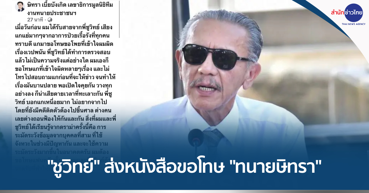 7 ม.ค. – “ชูวิทย์” ส่งหนังสือขอโทษ “ทนายษิทรา” พร้อมถอนฟ้องคดีอาญาและมรรยาททนาย ยันตรวจสอบแล้วไม่พบความผิด เผยกล่าวหาทนายคนดังเพราะกลุ่มคนที่ไม่ประสงค์ดีส่งข้อมูลผิดๆ ให้ ขณะที่ “ทนายษิทรา” พร้อมให้อภัยและถอนแจ้งความคดีอาญาเช่นกัน