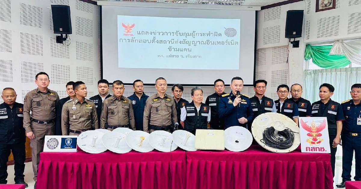 พล.ต.ท.ธัชชัย กล่าวว่า ผบ.ตร. ได้สั่งการให้ สอท. ดำเนินการสืบสวนรวบรวมพยานหลักฐานเพื่อขอหมายศาล จนนำไปสู่การจับกุมผู้กระท าผิดพร้อม ของกลาง โดยมีรายละเอียด ดังนี้ สอท. ร่วมกับ กสทช. เข้าตรวจสอบและจับกุมสถานีวิทยุคมนาคมโดยไม่ได้รับอนุญาต พบการลักลอบส่งสัญญาณโทรศัพท์และอินเทอร์เน็ตไปยังประเทศเพื่อนบ้าน ในพื้นที่ ต.เวียงพางคำ อ.แม่สาย จับกุมผู้กระทำผิดพร้อมด้วยของกลาง ประกอบด้วย เครื่องวิทยุคมนาคม, อุปกรณ์การจ่ายสัญญาณพร้อมกระแสไฟฟ้า และสายนำสัญญาณพร้อมหัวต่อเป็นจำนวนมาก ซึ่งเป็นความผิดฐาน “มีและใช้ซึ่งเครื่องวิทยุ คมนาคมและตั้งสถานีวิทยุคมนาคมโดยไม่ได้รับใบอนุญาต” ตาม พ.ร.บ.วิทยุคมนาคมฯ และฐาน “ประกอบกิจการโทรคมนาคมซึ่งต้องได้รับ ใบอนุญาตแบบที่หนึ่งโดยไม่ได้อนุญาต” ตาม พ.ร.บ.ว่าด้วยการประกอบกิจการโทรคมนาคมฯ ในการนี้ชุดจับกุมได้ทำการรื้อถอนอุปกรณ์ ทั้งหมดนำส่ง สภ.แม่สาย จ.เชียงราย เพื่อดำเนินคดีตามกฎหมายต่อไป ในเรื่องนี้ตนได้กำชับไปยังตำรวจทุกหน่วย ให้ร่วมกับหน่วยงานที่เกี่ยวข้องลงพื้นที่สืบสวนหาข่าว การลักลอบตั้งสถานีโทรคมนาคมผิดกฎหมายในลักษณะกล่าว เพื่อสกัดกั้นไม่ให้แก๊งคอลเซ็นเตอร์เข้าถึงสัญญาณได้โดยง่ายเหมือนในอดีตที่ผ่านมา. -412-สำนักข่าวไทย