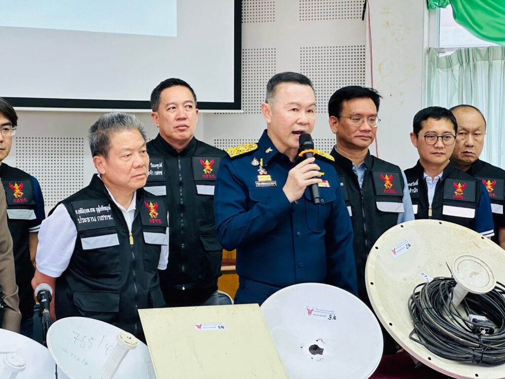 ศ.คลินิก นพ.สรณ บุญใบชัยพฤกษ์ ประธาน กสทช., พล.ต.อ.ดร.ณัฐธร เพราะสุนทร กสทช.ด้านกฎหมาย, พล.ต.ท.ดร.ธัชชัย ปิตะนีละบุตร ผู้ช่วย ผบ.ตร. ดูแลงานด้านป้องกันและปราบปรามอาชญากรรมเทคโนโลยี, พล.ต.ต.จิตติพนธ์ ผลพฤกษา ผบก.สอท.4 พร้อมด้วยเจ้าหน้าที่ กสทช. ร่วมกันแถลงผลการจับกุมสถานีโทรคมาคมผิดกฎหมาย พบส่งสัญญาณแรงสูงข้ามไปประเทศเพื่อนบ้านไกลกว่า 40 กม. จากการขยายผลพบเชื่อมโยงแก๊งคอลเซ็นเตอร์ พร้อมหารือเร่งออกประกาศ กสทช. เรื่องการอนุญาตและกำกับดูแลสถานีวิทยุคมนาคมบริเวณแนวชายแดน เพื่อแก้ไขการปัญหาการลักลอบส่งสัญญาณเอื้อแก๊งคอลเซ็นเตอร์