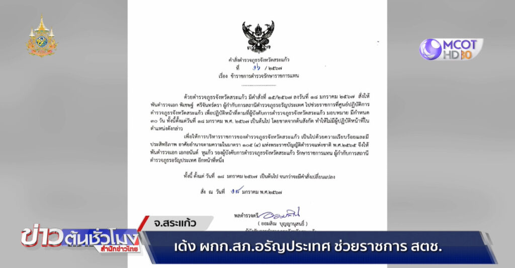 ล่าสุด พล.ต.ต.ออมสิณ บุญญานุสนธิ์ ผู้บังคับการตำรวจภูธรจังหวัดสระแก้ว มีคำสั่งให้ พ.ต.อ.พิเชษฐ์ ศรีจันทร์ตรา ผู้กำกับการสถานีตำรวจภูธรอรัญประเทศ ไปช่วยราชการที่ศูนย์ปฏิบัติการตำรวจภูธรจังหวัดสระแก้ว โดยขาดจากต้นสังกัด ทั้งนี้ ตั้งแต่วันที่ 18 มกราคม 2567 เป็นต้นไป .-สำนักข่าวไทย