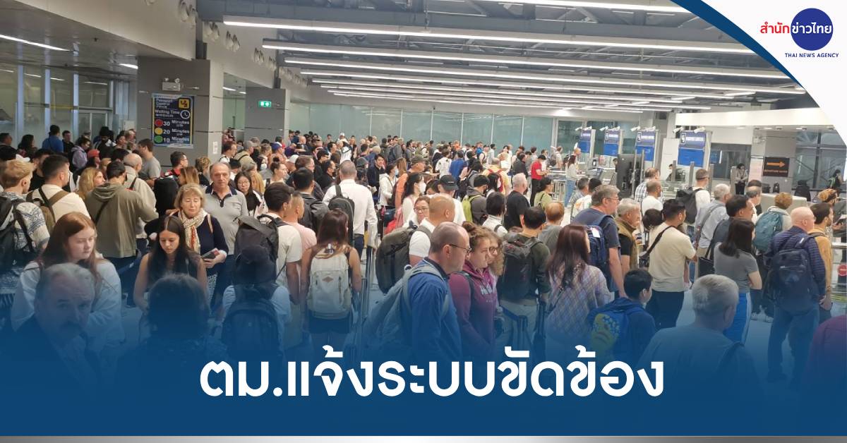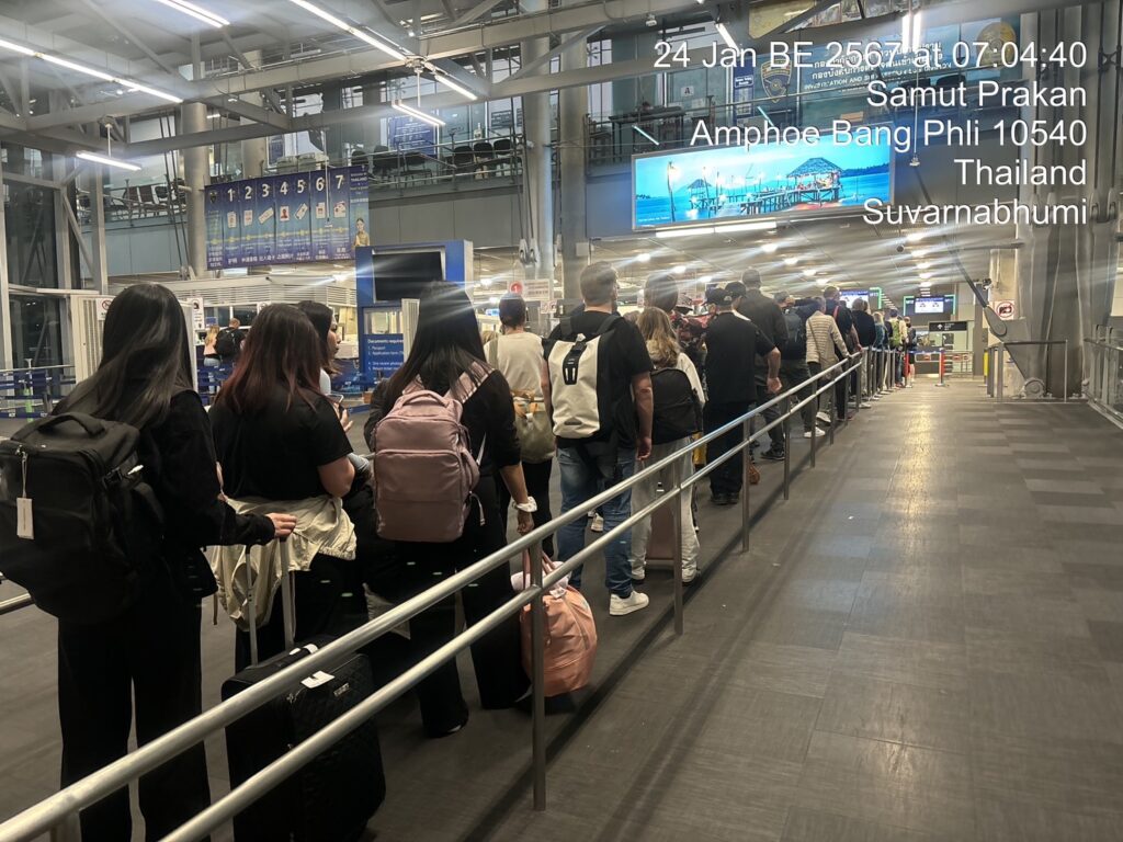 ท่าอากาศยานสุวรรณภูมิ 24 ม.ค.-สนามบินสุวรรณภูมิป่วน ระบบตรวจคนเข้าเมืองขัดข้อง ตั้งแต่เช้ามืดจนถึงขณะนี้ คนต่อแถวยาวล้นมาถึงจุดตรวจค้นสัมภาระ ตม.เร่งระดมกำลังแก้ปัญหา