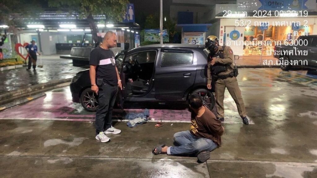 เมื่อวันที่ 29 มกราคม 2567 เวลา 00.31 น. ขณะที่ ส.ต.ท.ปฏิภาณ กะจิวผา ผบ.หมู่ กก.1 บก.ปพ เดินทางกลับภูมิลำเนา จว.ตาก ได้แวะปั๊มน้ำมัน และพบชายท่าทางมีพิรุธน่าสงสัยเดินวนเวียนบริเวณหน้าห้องน้ำหญิงหลายรอบ ต่อมาชายดังกล่าวได้บุกเข้าไปในห้องน้ำหญิงแล้วไปกระชากแขนของผู้หญิงออกมา ฝ่ายหญิงได้ตะโกนขอความช่วยเหลือเเละบอกว่าชายคนดังกล่าวมีอาวุธปืนข่มขู่เพื่อจะทำร้ายร่างกาย เห็นเหตุการณ์ไม่สู้ดีจึงเข้าไปเเสดงตัวว่าเป็นเจ้าหน้าที่ตำรวจพร้อมกับแสดงบัตรข้าราชการตำรวจให้ชายดังกล่าวดู และทำการตรวจค้นตัว พบอาวุธปืนลูกซองสั้น (ไทยประดิษฐ์) พร้อมเครื่องกระสุนจำนวน 4 นัด จึงได้ควบคุมตัวชายคนดังกล่าวพร้อมรีบประสานเจ้าหน้าที่ตำรวจ สภ.เมืองตาก ให้มารับตัวเพื่อไปดำเนินคดีตามกฎหมายต่อไป