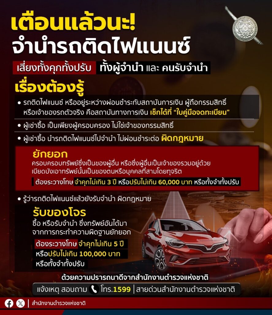 สำนักงานตำรวจแห่งชาติ จึงขอเตือนพี่น้องประชาชนว่า รถที่ติดไฟแนนซ์หรืออยู่ระหว่างผ่อนชำระกับสถาบันทางการเงิน ผู้ถือกรรมสิทธิ์หรือเจ้าของรถตัวจริงของรถคันดังกล่าว คือสถาบันทางการเงิน ส่วนผู้เช่าซื้อเป็นเพียงผู้ครอบครองเท่านั้น ไม่ได้เป็นเจ้าของกรรมสิทธิ์โดยสมบูรณ์ ดังนั้น การที่ผู้เช่าซื้อนำรถติดไฟแนนซ์ไปจำนำ แล้วผู้เช่าซื้อไม่ผ่อนชำระหรือไม่นำเงินมาปิดยอดไฟแนนซ์ที่เหลืออยู่ จะเข้าข่ายเป็นการ “ครอบครอบทรัพย์ซึ่งเป็นของผู้อื่นหรือซึ่งผู้อื่นเป็นเจ้าของรวมอยู่ด้วย เบียดบังเอาทรัพย์นั้นเป็นของตนหรือบุคคลที่สามโดยทุจริต” ซึ่งเป็นความผิดฐาน “ยักยอก” ต้องระวางโทษจำคุกไม่เกิน 3 ปี หรือปรับไม่เกิน 60,000 บาท หรือทั้งจำทั้งปรับ