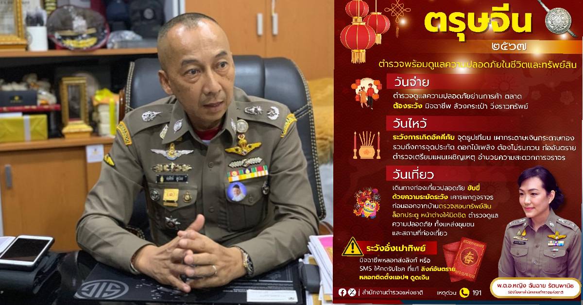 6 ก.พ. – ผบ.ตร.สั่งการ 4 มาตรการให้ตำรวจดูแลประชาชน เพิ่มความเข้มงวด ด้านความปลอดภัยในชีวิตและทรัพย์สิน อำนวยความสะดวกด้านการจราจร ป้องกันมิจฉาชีพฉวยโอกาสในเทศกาล “ตรุษจีน 2567” เน้น วันจ่าย วันไหว้ วันเที่ยว เตือนภัยออนไลน์หลอกกดลิงก์แจกอั่งเปา มอบโชค ย้ำระมัดระวังอัคคีภัย – จุดประทัด