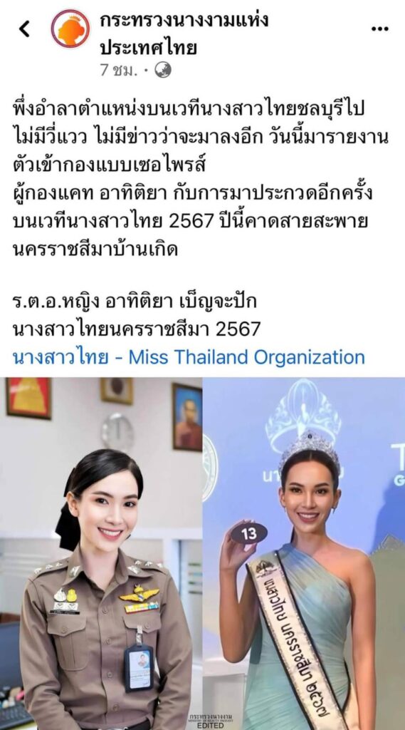 พล.ต.ท.อาชยน ไกรทอง โฆษกสำนักงานตำรวจแห่งชาติ เปิดเผยกรณี ร.ต.อ.หญิง อาทิติยา เบ็ญจะปัก หรือผู้กองแคท ตำรวจหญิงสังกัดสำนักงานเลขานุการตำรวจแห่งชาติ ในส่วนงานรับผิดชอบเรื่องงานเอกสาร และงานพิธีการด้านต่าง ๆ ของสำนักงานตำรวจแห่งชาติ เดินสายประกวดนางงามจนสังคมวิพากษวิจารณ์ว่า กรณีดังกล่าวอยู่ที่ต้นสังกัดที่ต้องควบคุมกำกับดูแลอยู่แล้ว หากมีการไปประกวดก็ต้องดูว่ามีการลา หรือขออนุญาตถูกต้องตามระเบียบหรือไม่ การมอบหมายหน้าที่ต้องไม่ให้เสียหายต่อราชการตำรวจ ซึ่งย้ำว่าตรงนี้ต้นสังกัดจะต้องเป็นคนตรวจสอบควบคุมดูแลเรื่องความประพฤติและการมอบหมายหน้าที่ลักษณะงาน ยอมรับว่าในระเบียบไม่มีข้อห้ามชัดเจนว่าไม่ให้ประกวดนางงาม แต่จะเป็นระเบียบลักษณะกว้าง ๆ ไม่ให้ประพฤติหรือไปกระทำการใดที่เป็นการเสื่อมเสีย เช่น การประพฤติตนที่ไม่เหมาะสม ทุกอย่างมีกฎระเบียบวินัยกำหนดไว้ ซึ่งไม่ว่าจะเป็นข้าราชการตำรวจหรือข้าราชการสังกัดใดก็จะมีระเบียบอยู่แล้ว หากพบว่ามีพฤติกรรมใดที่เห็นว่าไม่เหมาะสมก็จะมีตั้งแต่การเข้าไปตักเตือน หรือตั้งกรรมการตรวจสอบเรื่องวินัย
