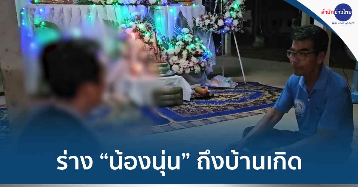 ร่างของน้องนุ่น มาถึงวัดบ้านดอนประทายเวลา 22.30 น. ซึ่งเร็วกว่าที่คาดการณ์ไว้ เมื่อมาถึงมีปู่และย่า รวมถึงญาติๆ และเพื่อนบ้านประมาณ 20 คน ทำพิธีตามประเพณี พ่อน้องนุ่นบอกว่า การนำร่างของลูกสาวกลับมาครั้งนี้ ได้รับความช่วยเหลือจาก “หนุ่ม กรรชัย” ประสานเรื่องรถของมูลนิธิ และโลงใส่ร่างของน้องนุ่น เดินทางกลับมาที่ จ.อุบลราชธานี