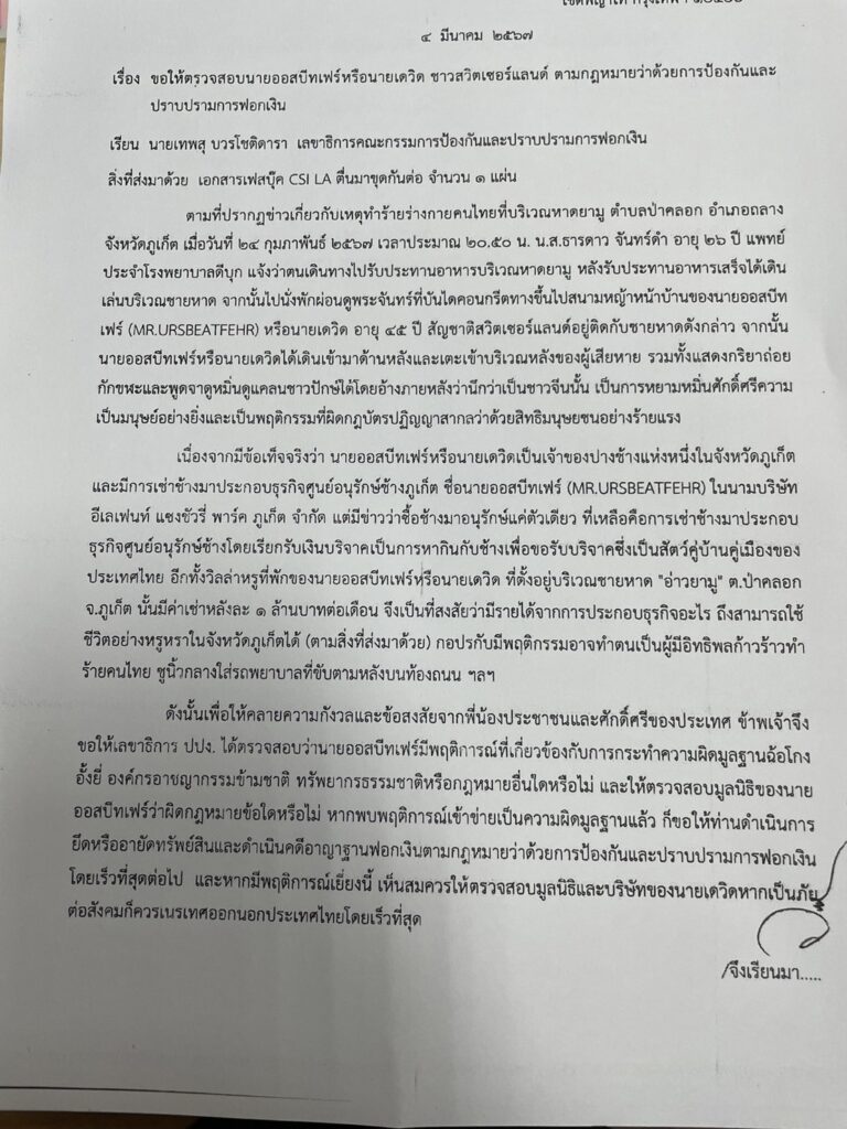 ปปง. 4 มี.ค. – “วัชระ เพชรทอง” อดีต สส.พรรคประชาธิปัตย์ ยื่น ปปง.ตรวจเส้นทางการเงินนักธุรกิจชาวสวิตฯ ที่ก่อเหตุทำร้ายร่างกายหมอที่ จ.ภูเก็ต