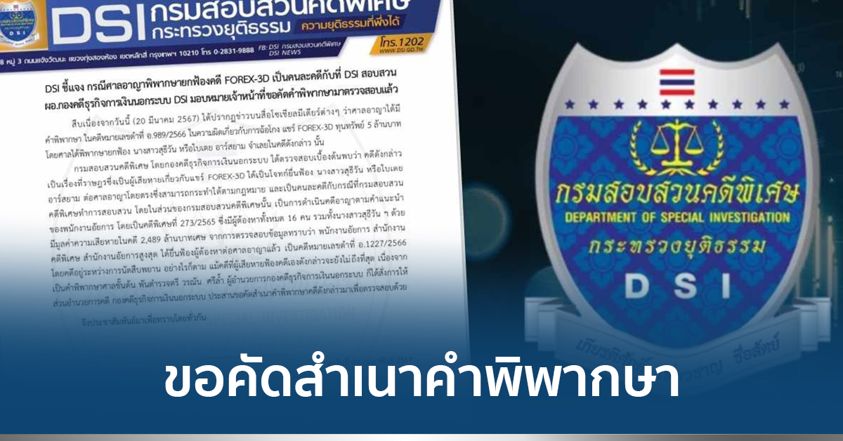 20 มี.ค.- DSI ชี้แจงกรณีศาลอาญาพิพากษายกฟ้องคดี FOREX-3D เป็นคนละคดีกับที่ DSI สอบสวน ผอ.กองคดีธุรกิจการเงินนอกระบบ DSI มอบหมายเจ้าหน้าที่ขอคัดคำพิพากษามาตรวจสอบแล้ว