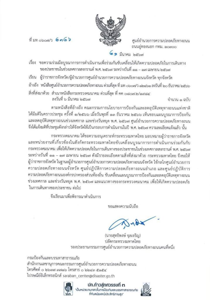 วันนี้ (24 มี.ค. 67) นายสุทธิพงษ์ จุลเจริญ ปลัดกระทรวงมหาดไทย เปิดเผยว่า ในช่วงเทศกาลสงกรานต์ พ.ศ. 2567 ซึ่งเป็นวันหยุดต่อเนื่อง โดยคาดการณ์ว่าจะมีประชาชนเดินทางเพื่อกลับภูมิลำเนา ท่องเที่ยว หรือทำบุญ ด้วยรถยนต์ส่วนบุคคล หรือรถสาธารณะเป็นจำนวนมาก และเพื่อให้เกิดความปลอดภัยในการเดินทางของพี่น้องประชาชน ลดการเกิดอุบัติเหตุบนท้องถนน ในช่วงเทศกาลสงกรานต์ 2567 ระหว่างวันที่ 11 – 17 เมษายน 2567 ตนจึงได้มีหนังสือสั่งการไปยังผู้ว่าราชการจังหวัดทุกจังหวัดในฐานะผู้อำนวยการศูนย์อำนวยการความปลอดภัยทางถนนจังหวัด ใช้กลไกศูนย์อำนวยการความปลอดภัยทางถนนจังหวัด/อำเภอ และศูนย์ปฏิบัติการความปลอดภัยทางถนนองค์กรปกครองส่วนท้องถิ่น ร่วมกันขับเคลื่อนแผนบูรณาการป้องกันและลดอุบัติเหตุทางถนนช่วงเทศกาล และช่วงวันหยุด พ.ศ. 2567 และแนวทางของกระทรวงคมนาคม เพื่อให้เกิดความปลอดภัยในการเดินทางของประชาชน