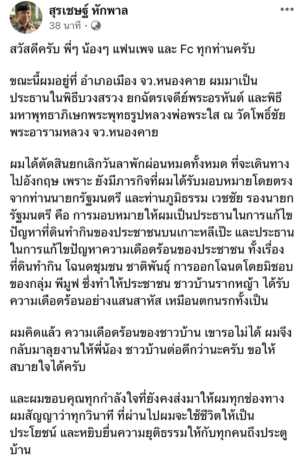 ผมได้ตัดสินยกเลิกวันลาพักผ่อนหมดทั้งหมด ที่จะเดินทางไปอังกฤษ เพราะยังมีภารกิจที่ผมได้รับมอบหมายโดยตรงจากท่านนายกรัฐมนตรี และท่านภูมิธรรม เวชชัย รองนายกรัฐมนตรี คือ การมอบหมายให้ผมเป็นประธานในการแก้ไขปัญหาที่ดินทำกินของประชาชนบนเกาะหลีเป๊ะ และประธานในการแก้ไขปัญหาความเดือดร้อนของประชาชน ทั้งเรื่องที่ดินทำกิน โฉนดชุมชน ชาติพันธุ์ การออกโฉนดโดยมิชอบของกลุ่มพีมูฟ ซึ่งทำให้ประชาชน ชาวบ้านรากหญ้า ได้รับความเดือดร้อนอย่างแสนสาหัส เหมือนตกนรกทั้งเป็น