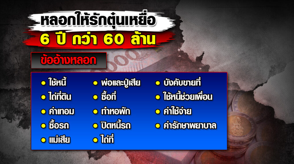 ต่อมา น.ส.ไอซ์ ได้บอกกับผู้เสียหายว่าตนเองป่วยเป็นโรคมะเร็ง และโรคร้ายแรงต้องใช้เงินมาเป็นค่ารักษาจำนวนมากผู้เสียหายเกิดความเห็นใจประกอบกับชอบพอในตัว น.ส.ไอซ์ จึงได้โอนเงินให้กับคนร้ายเรื่อยมา โดย น.ส.ไอซ์ ได้สร้างเรื่องหลอกลวงผู้เสียหายจำนวนมากมายหลายเรื่อง เช่น การชดใช้หนี้สินที่กู้ยืมมา, การชดใช้หนี้ของครอบครัว, ค่าใช้จ่ายอุปโภคบริโภคในชีวิตประจำวัน, ค่ารักษาพยาบาล, ชักชวนลงทุนเกี่ยวกับอสังหาริมทรัพย์ เป็นต้น
