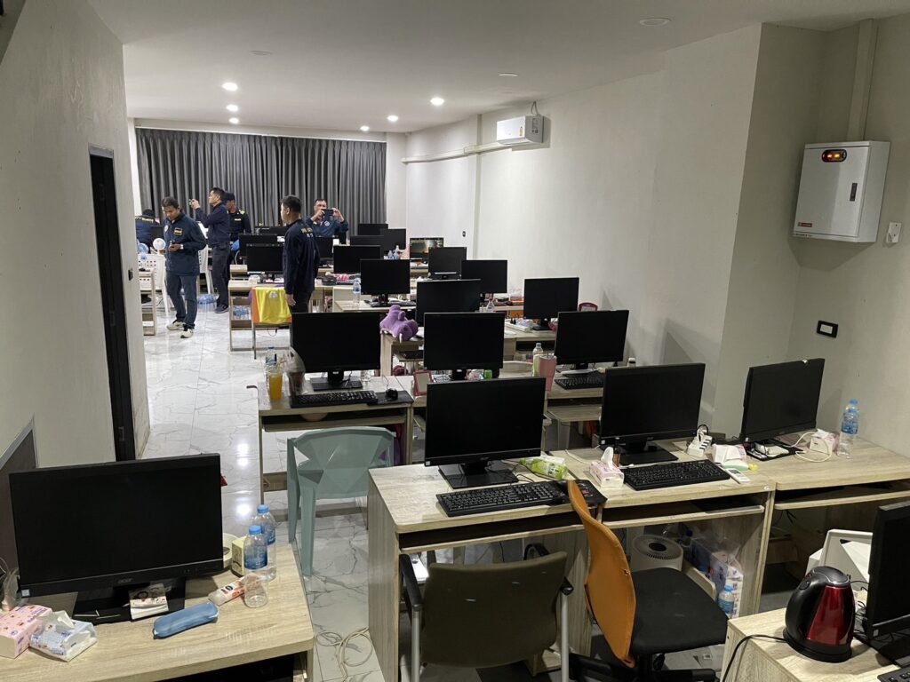 จากการตรวจสอบข้อมูลการสื่อสารและการใช้อินเทอร์เน็ตก่อนเข้าจับกุม รวมทั้งการเก็บและวิเคราะห์ข้อมูลที่บันทึกไว้ในระบบคอมพิวเตอร์ ประกอบการซักถาม หลังการตรวจค้นจับกุมพบว่า มิจฉาชีพกลุ่มนี้ทำการติดต่อ หลอกลวงเหยื่อหลากหลายวิธีในหลายประเทศ โดยวิธีการหนึ่งที่คนร้ายใช้ คือ จะทำการหลอกลวงเหยื่อผ่านช่องทาง Social media โดยเฉพาะแอปฯ Telegram ใช้โทรศัพท์มือถือเป็นตัวกระจายสัญญาณอินเทอร์เน็ตสื่อกลาง ซึ่งคนร้ายจะเชิญชวนเหยื่อให้ร่วมแนะนำ review โรงแรม, รีสอร์ท หรือที่พักต่างๆ แล้วแจ้งว่าได้รับรางวัลตอบแทนเป็นตั๋วเครื่องบินหรือที่พักฟรี และให้เหยื่อกรอกข้อมูลส่วนบุคคลต่าง ๆ พร้อมส่งข้อความแนบลิงค์ให้กดยืนยันเพื่อรับรางวัล เมื่อเหยื่อหลงกลกดลิ้งค์ก็จะเป็นการเริ่มการติดตั้งโปรแกรมเข้ามือถือ แล้วคนร้ายจะใช้ข้อมูลส่วนบุคคลที่ได้ก่อนหน้านี้ไปกระทำการเข้าถึงข้อมูลบัญชีธนาคาร mobile banking และหลอกดูดเงินเหยื่อในลำดับถัดไป หรือใช้วิธีการหลอกให้เหยื่อร่วมลงทุนด้วยวิธีต่างๆ ในการนี้ชุดจับกุม ทั้งตำรวจ กสทช.และ ดีเอสไอ ได้ทำการรื้อถอนและตรวจยึดอุปกรณ์ทำงเทคโนโลยี, คอมพิวเตอร์, โทรศัพท์มือถือ, รวมทั้งซิมการ์ด (ซิมผี) มากกว่า 1,300 ซิม ซึ่งไม่ได้ลงทะเบียนหรือลงทะเบียนไม่ถูกต้องตามกฎหมายและประกาศ กสทช.กำหนด ไปตรวจสอบทางเทคนิคเพื่อขยายผลไปยังผู้ที่เกี่ยวข้องต่อไป.-412- สำนักข่าวไทย