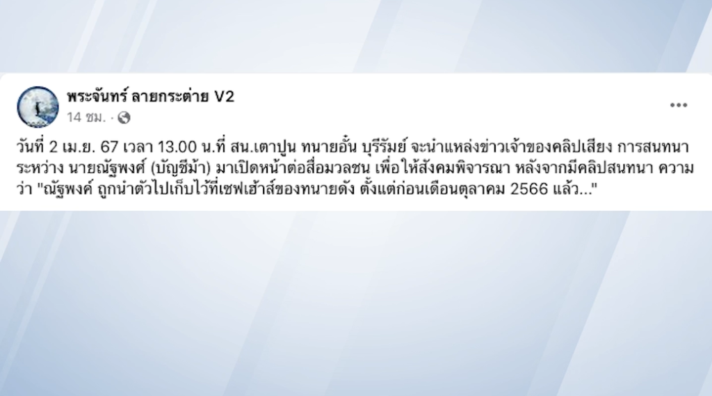 และเมื่อเวลาประมาณ 10.00 น. ที่ผ่านมา ทนายตั้ม พร้อมทีมงานทนายความ นำหลักฐานการโพสต์เฟซบุ๊กของ เพจพระจันทร์ลายกระต่าย V2 พร้อมคลิปเสียงที่เป็นเนื้อหาการพูดคุย ซึ่งระบุว่า เป็นนายณัฐพงศ์ หนึ่งในบัญชีม้าในเครือข่ายเว็บพนันที่เชื่อมโยงกับบัญชีคนสนิทของบิ๊กตำรวจ โดยเนื้อหาการพูดคุย ระบุว่าทนายตั้มได้ลักพาตัวนายณัฐพงศ์ ไปกักขังในเซฟเฮาส์ ช่วงเดือนตุลาคม ปี 66 ที่ผ่านมา