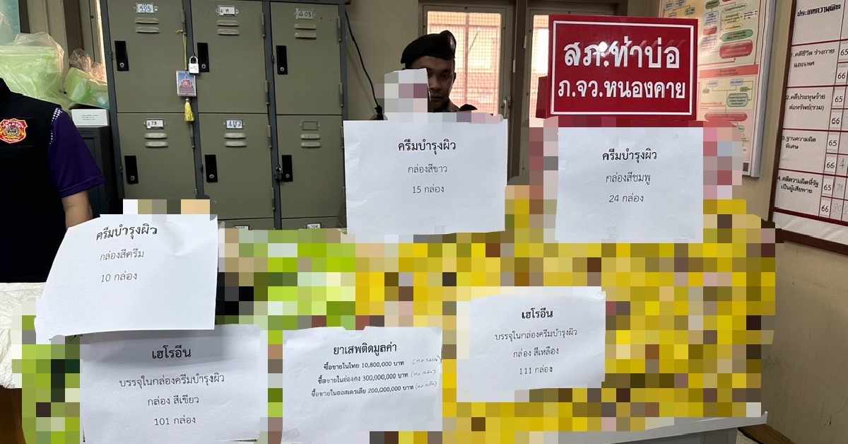 พล.ต.ท.ภาณุรัตน์ หลักบุญ เลขาธิการ ป.ป.ส. เผยถึงการจับกุมชาย อายุ 70 ปี พร้อมของกลางเฮโรอีน 22.23 กก. ซุกซ่อนในหลอดครีมบำรุงผิว จำนวน 261 กล่อง เตรียมจัดส่งปลายทางประเทศไต้หวัน เหตุเกิดที่ บริษัทขนส่งเอกชน อ.ท่าบ่อ จ.หนองคาย โดยการจับกุมนี้เริ่มจากการขยายผลเคสจับกุมที่เกาหลีใต้ เมื่อช่วงปลายเดือนมีนาคมที่ผ่านมา