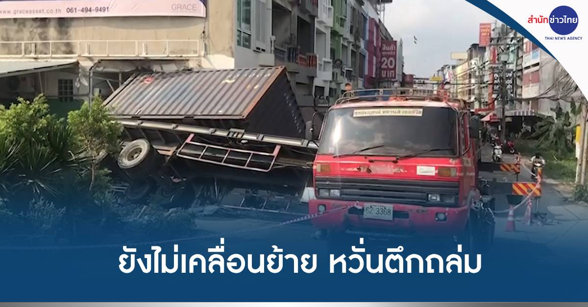 กทม. 6 เม.ย.-เจ้าหน้ายังไม่สามารถเคลื่อนย้ายได้ รถพ่วงบรรทุกตู้คอนเทนเนอร์ ที่เสียหลักไหลชนอาคารพาณิชย์ ย่านสะพานกรุงนนท์ หวั่นอาคารพังถล่มซ้ำ วางแผนนำอุปกรณ์ค้ำยันอาคาร ก่อนเร่งเคลื่อนย้ายภายในวันนี้