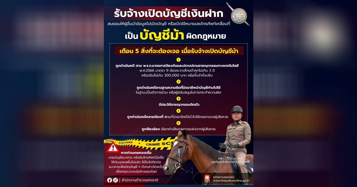 สำนักงานตำรวจแห่งชาติจึงขอเตือนที่น้องประชาชน ถึง 5 สิ่งที่จะเกิดขึ้น หากท่านรับจ้างเปิดบัญชีม้า ดังต่อไปนี้