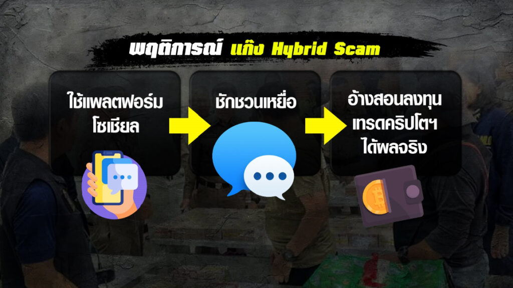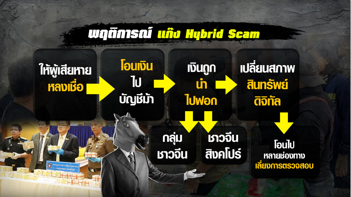จากกรณีผู้เสียหายถูกหลอกลงทุนในลักษณะ Hybrid Scam ซึ่งคนร้ายใช้วิธีการชักชวนผู้เสียหายให้ลงทุนสกุลเงิน ดิจิทัลผ่านแพลตฟอร์มปลอม จากนั้นให้ผู้เสียหายซื้อเงินสกุลต่างประเทศ และโอนไปตามเลขกระเป๋าเงินดิจิทัลตามที่คนร้ายระบุ ก่อนที่จะถูกโอนเข้าบัญชีของแพลตฟอร์มเทรดเงินดิจิทัล ต่อมาเจ้าหน้าที่ตำรวจจากกองบัญชาการตํารวจสืบสวนสอบสวนอาชญากรรมทางเทคโนโลยี หรือ สอท. สืบสวนจนได้ข้อมูลที่เชื่อมโยงไปสู่คนร้ายตัวจริงที่ใช้กระเป๋าเงินดิจิทัลดังกล่าว คือ นายซู ชาวสัญชาติจีนกับพวก และยังพบเส้นทางการเงินเชื่อมโยงนอมินีรูปแบบนิติบุคคล สัญชาติไทยที่เชื่อว่าจดทะเบียนเพื่ออำพรางการทำธุรกรรม โดยการเข้าซื้ออสังหาริมทรัพย์ และทรัพย์สินต่างๆ