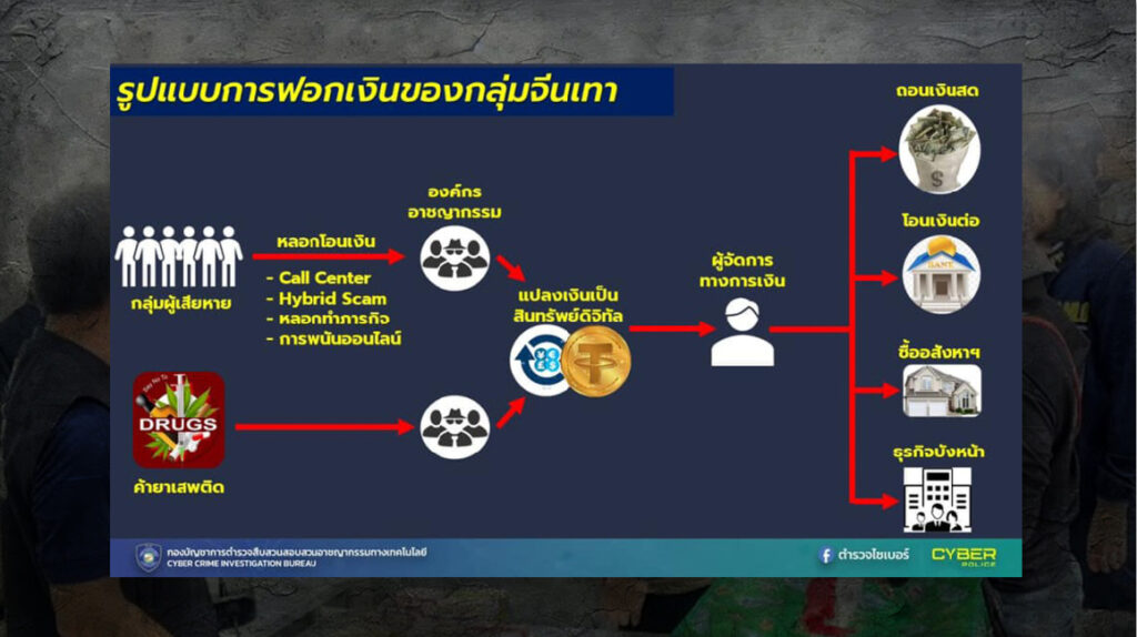 ในส่วนคดีอาญา สน.ดินแดง พบว่าคนร้ายใช้วิธีการก่อเหตุโดยอาศัยวิธีการสุ่มติดต่อหาประชาชนผ่านแพลตฟอร์มสื่อโซเชียลต่างๆ แล้วชักชวนพูดคุยให้เกิดความเชื่อว่าคนร้ายสอนการลงทุนเทรดคริปโตเคอเรนซีเพื่อได้ผลกำไรจริง โดยผู้เสียหายในเคสนี้ถูกชักชวนให้โอนเงินไปยังบัญชีธนาคารของบุคคลต่างๆ (บัญชีม้า) ที่คนร้ายอ้างว่า เป็นบัญชีตัวแทนรับแลกเปลี่ยนเงินบาทเป็นเงินสกุลดิจิทัล เพื่อโอนเข้าแอปเทรดเหรียญดิจิทัล ซึ่งเป็นแอปปลอม จากการสืบสวนเส้นทางการเงินพบว่าปลายทางของเงินนั้น ถูกนำไปผ่านกระบวนการฟอกเงินด้วยระบบการเงินใต้ดิน และพบว่าหนึ่งในผู้ร่วมขบวนการเป็นกลุ่มชาวจีน และชาวจีนสิงคโปร์ โดยเป็นผู้จ้างวานเพื่อจดทะเบียนบริษัทนอมินี และนำข้อมูลบริษัทไปเปิดบัญชีธนาคารเพื่อนำมาใช้รับเงินจากการกระทำความผิด แล้วนำเงินส่วนใหญ่ที่ได้มาเปลี่ยนสภาพไปเป็นสินทรัพย์ดิจิทัล แล้วโอนต่อไปหลายช่องทาง เพื่อหลีกเลี่ยงการตรวจสอบ