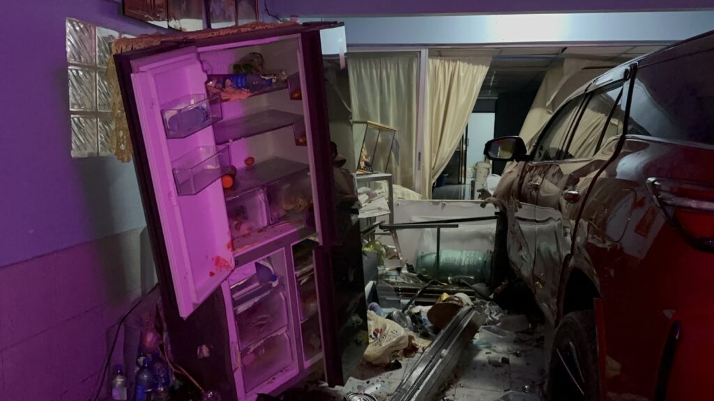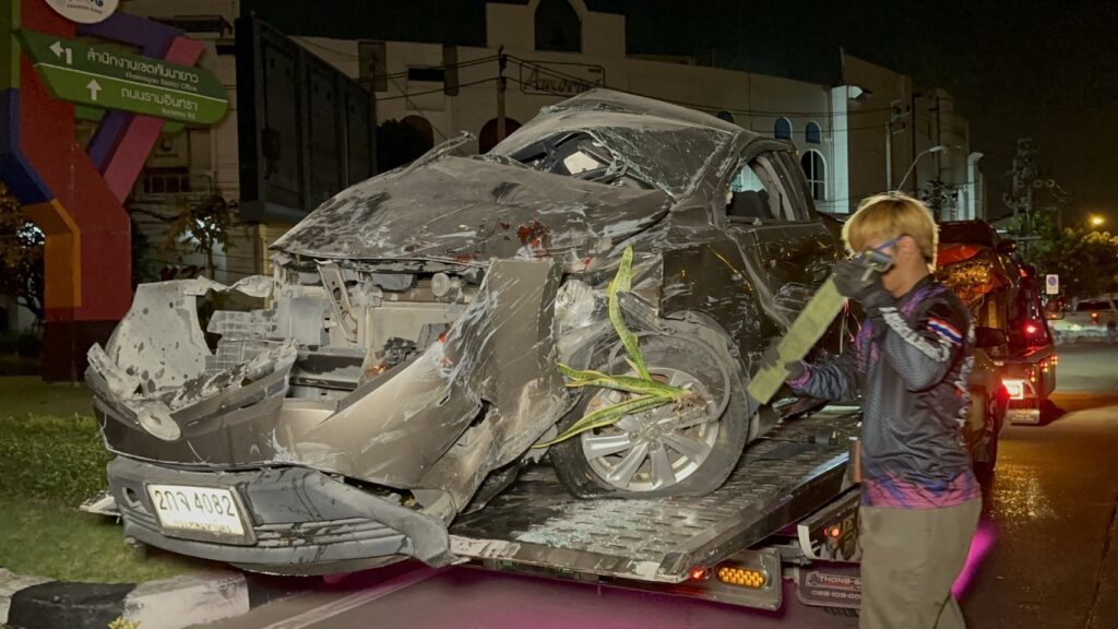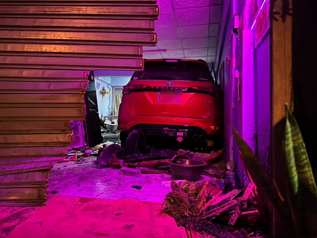 ที่เกิดเหตุพบรถยนต์ ยี่ห้อโตโยต้า รุ่นฟอร์จูนเนอร์ สีแดง ป้ายแดง สภาพพุ่งชนประตูรั้วเหล็กด้านหน้าเข้าไปอยู่ภายในบ้านได้รับความเสียหาย นอกจากนี้ยังพบมีรถยนต์สีดำ ซึ่งจอดอยู่หน้าบ้านหลังดังกล่าวอีกคันได้รับความเสียหาย จากการตรวจภายในบ้านพบสิ่งของเครื่องใช้พังยับเยิน เจ้าหน้าที่จึงนำรถยกมาดึงลากรถฟอร์จูนเนอร์ ออกจากตัวบ้าน ส่วนผู้ขับขี่เป็นชายอายุประมาณ 60-65 ปี นำตัวไปสอบปากคำที่ สน.บางชัน