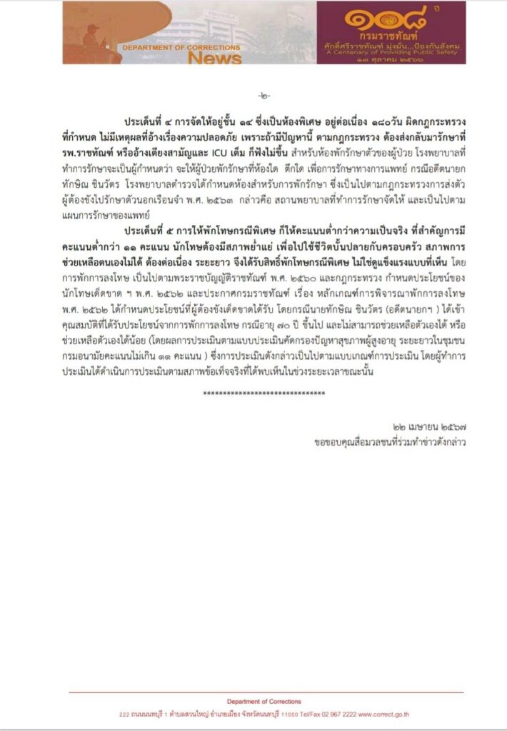 เมื่อวันจันทร์ที่ 22 เมษายน 2567 ตามที่สื่อมวลชนเสนอข่าว “หมอวรงค์” ส่งข้อมูลผู้ตรวจฯ ยื่น ป.ป.ช. ในการช่วยเหลือนายทักษิณ ชินวัตร อดีตนายกรัฐมนตรี ไม่ต้องติดคุก โดยมีประเด็นต่าง ๆ เพื่อเรียกร้องคำตอบให้กับสังคมนั้น กรมราชทัณฑ์ขอเรียนว่าได้ดำเนินการเป็นไปตามกระบวนการยุติธรรม กฎ ระเบียบ และภายใต้กฎหมาย ซึ่งสามารถชี้แจงได้ตามประเด็นต่าง ๆ ดังนี้