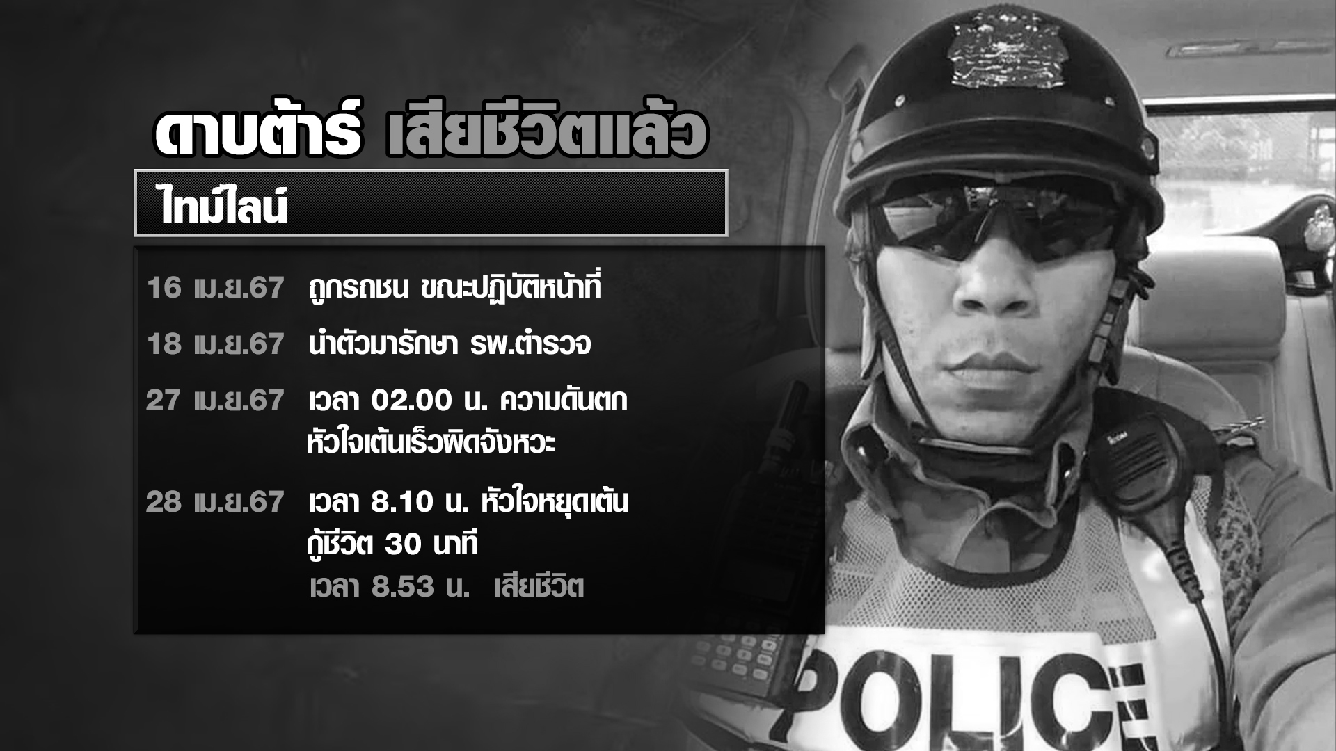 กทม. 28 เม.ย.- ข่าวเศร้าเช้าวันหยุด ด.ต.ปิยะนันท์ สีเสื้อ หรือ “ดาบต้าร์“ เสียชีวิตแล้ว หลังบาดเจ็บสาหัสจากเหตุเก๋งพุ่งชนขณะอำนวยการจราจรช่วงสงกรานต์