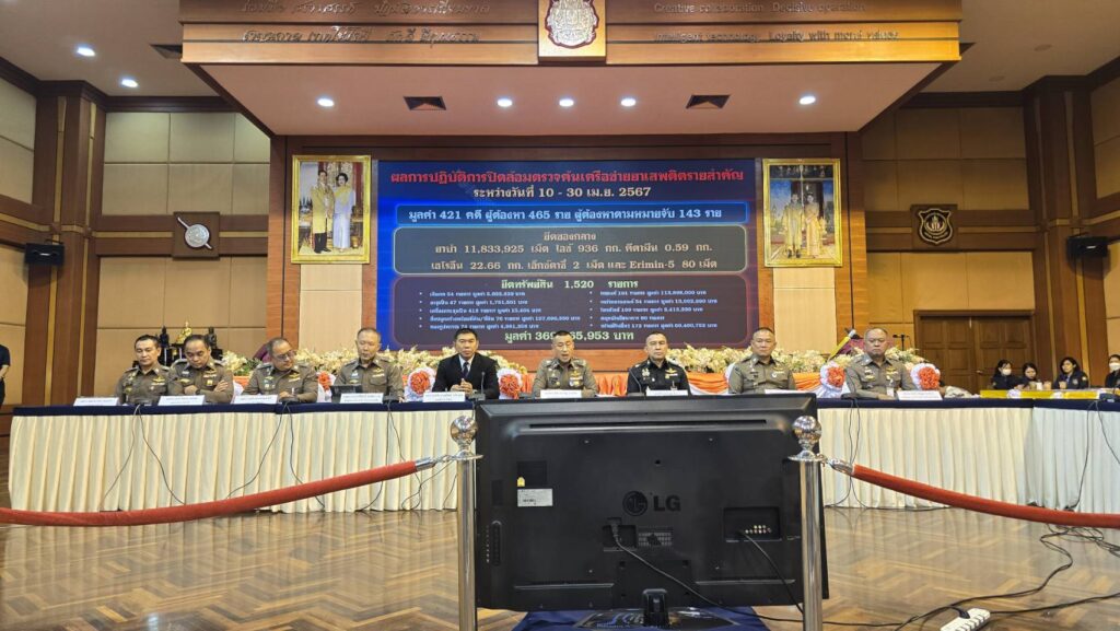 บช.ปส. 3 พ.ค. – พล.ต.ท.สำราญ นวลมา ผู้ช่วย ผบ.ตร. แถลงผลปิดล้อมตรวจค้นเครือข่ายยาเสพติดทั่วประเทศ ระหว่าง 10-30 เม.ย.67 ยึดทรัพย์สิน 1,520 รายการ มูลค่า 369 ล้านบาท