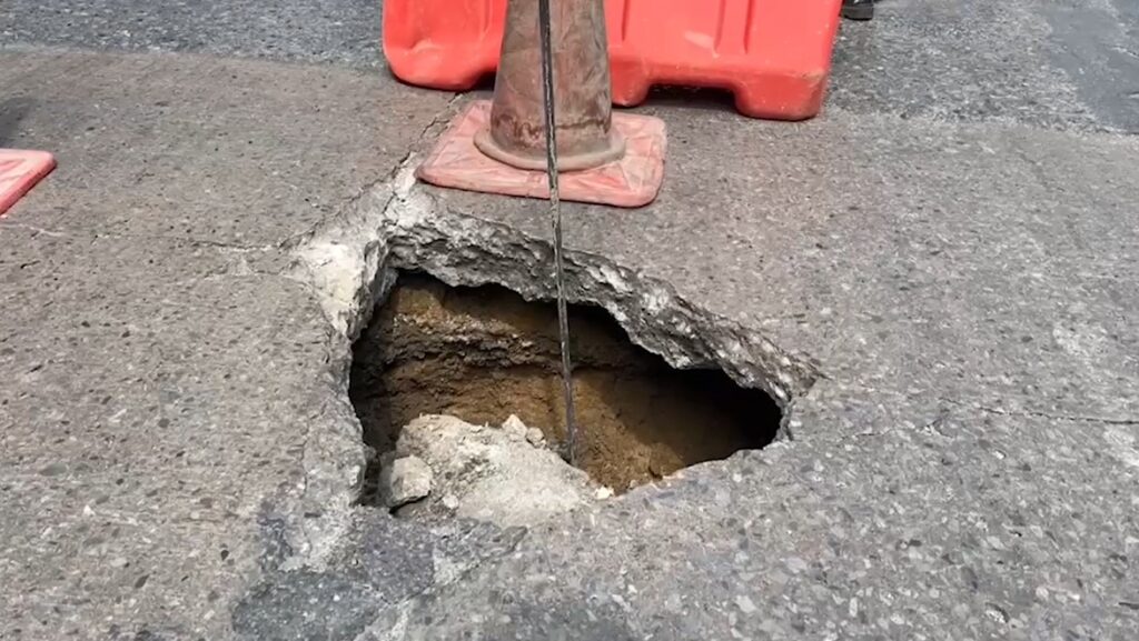 นนทบุรี 10 พ.ค. – ถนนแจ้งวัฒนะ ใต้สะพานข้ามคลองประปา ทรุดตัว คาดมาจากด้านใต้ถนนเป็นโพรงเดิมและแตกร้าวอยู่แล้ว ที่ผ่านมามีฝนตกอาจทำให้กัดเซาะลงไปด้านล่าง ล่าสุดเจ้าหน้าที่กรมทางหลวง นำหินคลุกมาเทและบดอัดใต้ผิวจราจร ก่อนใช้ซีเมนต์ชนิดแห้งเร็วเททับด้านบน