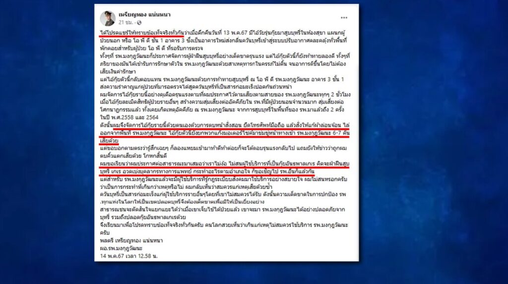 ด้านคู่กรณีที่เป็น ผอ.โรงพยาบาล คือ พลตรี เหรียญทอง แน่นหนา ผู้อำนวยการโรงพยาบาลมงกุฎวัฒนะ นอกจากเมื่อวานได้โพสต์เฟซบุ๊กเล่าเหตุการณ์ที่เกิดขึ้น แบบค่อนข้างมีอารมณ์ว่า ได้โปรดแชร์ให้ทราบข้อเท็จจริงทั่วกันว่า เมื่อดึกคืนวันที่ 13 พ.ค.67 มีไอ้วัยรุ่นกุ๊ยมาสูบบุหรี่ในห้องสุขา แผนกผู้ป่วยนอก หรือ โอพีดี ชั้น 1 อาคาร 3 ซึ่งเป็นอาคารใหม่ส่งกลิ่นควันบุหรี่เข้าสู่ระบบปรับอากาศคละคลุ้งทั่วพื้นที่พักคอยสำหรับผู้ป่วย โอ พี ดี ที่รอรับการตรวจ ทั้งที่ รพ.มงกุฎวัฒนะ ก็ประกาศจัดการผู้ฝ่าฝืนสูบบุหรี่อย่างเด็ดขาดรุนแรง แต่ไอ้กุ๊ยตัวนี้ก็ยังท้าทายลองดี ทั้งที่ภริยาของมันได้เข้ารับการรักษาตัวใน รพ.มงกุฎวัฒนะ ด้วยสาเหตุทารกในครรภ์ไม่ดิ้น จนอาการดีขึ้นโดยไม่ต้องเสียเงินค่ารักษา แต่ไอ้กุ๊ยตัวนี้กลับตอบแทน รพ.มงกุฎวัฒนะด้วยการท้าทายสูบบุหรี่ ณ โอ พี ดี รพ.มงกุฎวัฒนะ อาคาร 3 ชั้น 1 ส่งความรำคาญแก่ผู้ป่วยที่มารอตรวจได้สูดควันบุหรี่ที่เป็นสารก่อมะเร็งปอดกันถ้วนหน้า ผมจัดการไอ้กุ๊ยรายนี้อย่างดุเดือดรุนแรงตามที่ผมประกาศไว้ ตามเสียงตามสายของ รพ.มงกุฎวัฒนะ ทุกๆ 2 ชั่วโมง เมื่อไอ้กุ๊ยละเมิดสิทธิผู้ป่วยรายอื่นๆ สร้างความสุ่มเสี่ยงต่ออัคคีภัยใน รพ. ที่มีผู้ป่วยนอนจำนวนมาก สุ่มเสี่ยงต่อโศกนาฏกรรมแล้ว ทั้งเคยเกิดเหตุอัคคีภัย ณ รพ.มงกุฎวัฒนะ จากการสูบบุหรี่ในพื้นที่ของ รพ.มาแล้วถึง 2 ครั้ง ในปี พ.ศ.2558 และ 2564 ดังนั้นผมจึงจัดการไอ้กุ๊ยรายนี้ด้วยตนเองด้วยการตบหน้าสั่งสอน ยึดมือถือ แล้วสั่งให้แก้ผ้าล่อนจ้อน ไล่ออกจากพื้นที่ รพ.มงกุฎวัฒนะ ไอ้กุ๊ยตัวนี้ยังยกพวกแก๊งมอเตอร์ไซค์มาข่มขู่หน้าทางเข้า รพ.มงกุฎวัฒนะ 6-7 คันเสียด้วย ผมขอเรียนว่าผมประกาศต่อสาธารณะมาเสมอว่าเราไม่ง้อ ไม่สนผู้ใช้บริการที่เป็นกุ๊ยอันธพาลเกเร คิดจะฝ่าฝืนสูบบุหรี่ เกเร อวดเบ่งบุคลากรทางการแพทย์ กระทำอะไรตามอำเภอใจ ก็ขอเชิญไป รพ.อื่นก็แล้วกัน