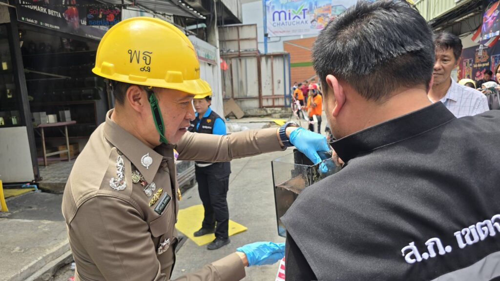 พล.ต.ท.ไตรรงค์ ผิวพรรณ ผู้บัญชาการสำนักงานพิสูจน์หลักฐานตำรวจ (ผบช.สพฐ.) พล.ต.ต.วาที อัศวุตมางกุร ผบก.สพฐ.ตร. พร้อมด้วยกำลังเจ้าหน้าที่ตำรวจพิสูจน์หลักฐาน ลงพื้นที่ตรวจสอบจุดเกิดเหตุเพลิงไหม้ บริเวณโครงการตลาดศรีสมรัตน์ โซนจำหน่ายปลากัดและสัตว์เลี้ยง ย่านจตุจักร อีกครั้ง ซึ่งขณะนี้อยู่ระหว่างการตรวจสอบพื้นที่เกิดเหตุ ซึ่งเป็นจุดที่คาดว่าจะเป็นต้นเพลิง