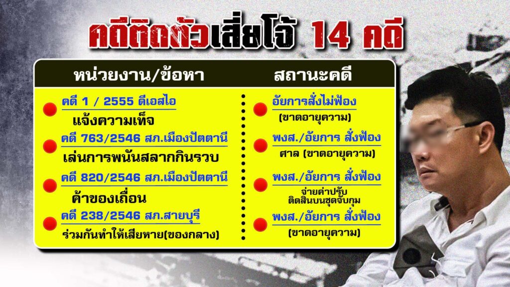 หากย้อนไป “เสี่ยโจ้ น้ำมันเถื่อน” พัวพันกับธุรกิจสีเทาในภาคใต้มายาวนาน เคยตกเป็นผู้ต้องหาถึง 14 คดี โดยเป็นคดีที่เกิดขึ้นในจังหวัดปัตตานี ถึง 10 คดี เช่น เล่นการพนันหวยเถื่อน ปี 2546, ปลอมตราสำหรับการเดินทางระหว่างประเทศ ปี 2557 และเรือไม่มีใบอนุญาตทำการประมงแต่ใช้ทำการประมง ปี 2561 โดย สภ.เมืองชลบุรี อยู่ระหว่างการสอบสวนออกหมายเรียกครั้งที่ 2 เป็นต้น