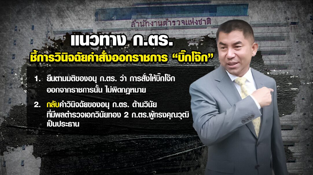 แนวทาง ที่ ก.ตร. จะชี้มีเพียง 2 แนวทาง คือ 1 ยืนตามมติของ อนุ ก.ตร. ว่า การสั่งให้ “บิ๊กโจ๊ก” ออกจากราชการนั้น ไม่ผิดกฎหมาย และแนวทางที่ 2 คือ กลับคำวินิจฉัยของอนุ ก.ตร. ด้านวินัย