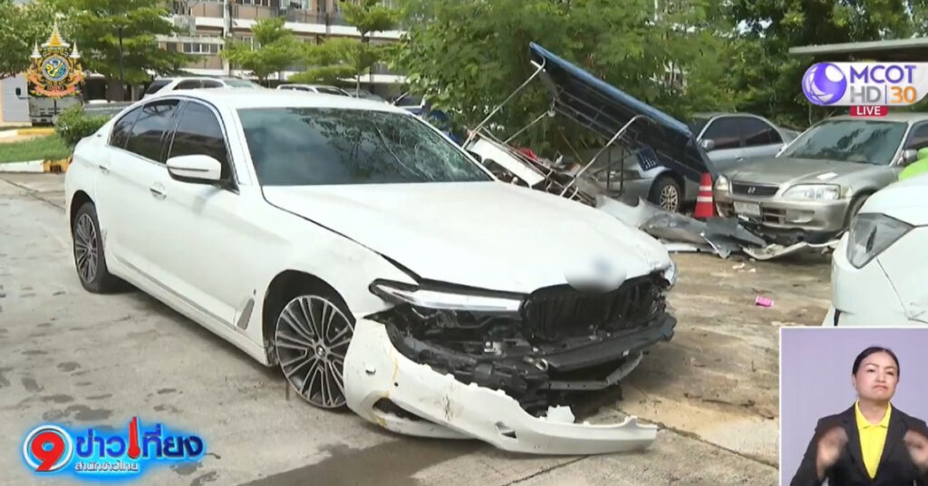 กล้องหน้ารถจับภาพนาทีหนุ่มใหญ่ขับรถ BMW มาด้วยความเร็วสูง ก่อนพุ่งชนรถจักรยานยนต์ที่ขี่อยู่ข้างหน้า ทำให้รถจักรยานยนต์ล้มคว่ำ คนขี่กระเด็นไปตามพื้นถนน ส่วนหญิงที่นั่งซ้อนท้ายตัวลอยกระเด็นออกจากรถ ก่อนร่างจะตกลงไปบนอยู่ถนนสุขาภิบาล 5 หน้าโรงเรียนสารสาสน์วิเทศสายไหม หลังจากรถ BMW ชนแล้ว ไฟท้ายรถ BMW ไม่เห็นแม้แต่สัญญาณไฟแตะเบรกโชว์ หรือรถชะลอรถดูเลยแม้แต่น้อย ทำให้รถที่เห็นเหตุการณ์ต้องช่วยกันโทรแจ้งตำรวจและกู้ภัย เพื่อให้ช่วยพาคนเจ็บที่เป็นชาย 1 คน หญิง 1 คน ส่งโรงพยาบาล เนื่องจากทั้งคู่บาดเจ็บสาหัส