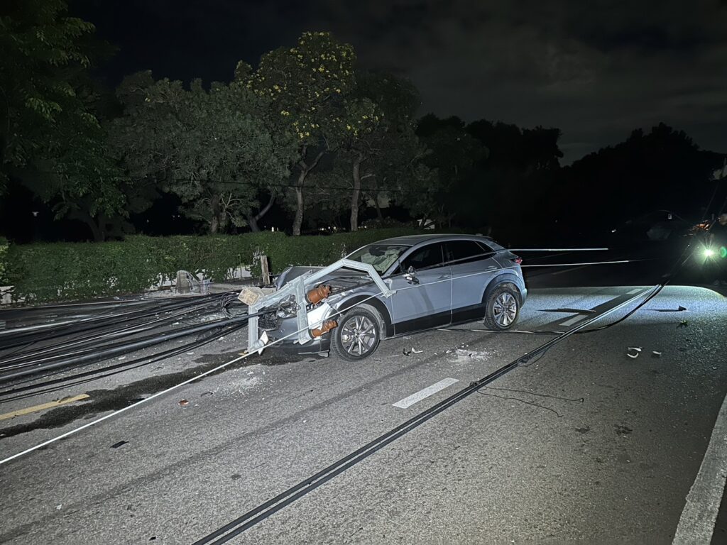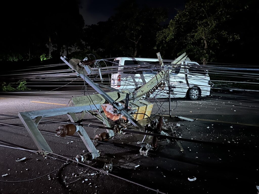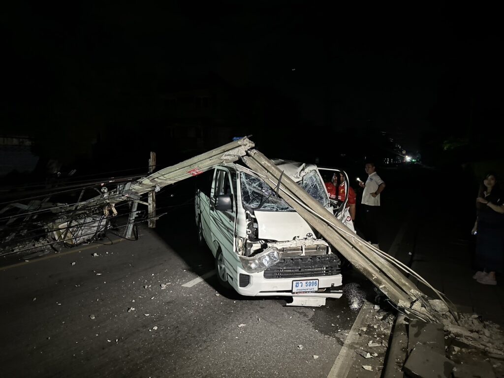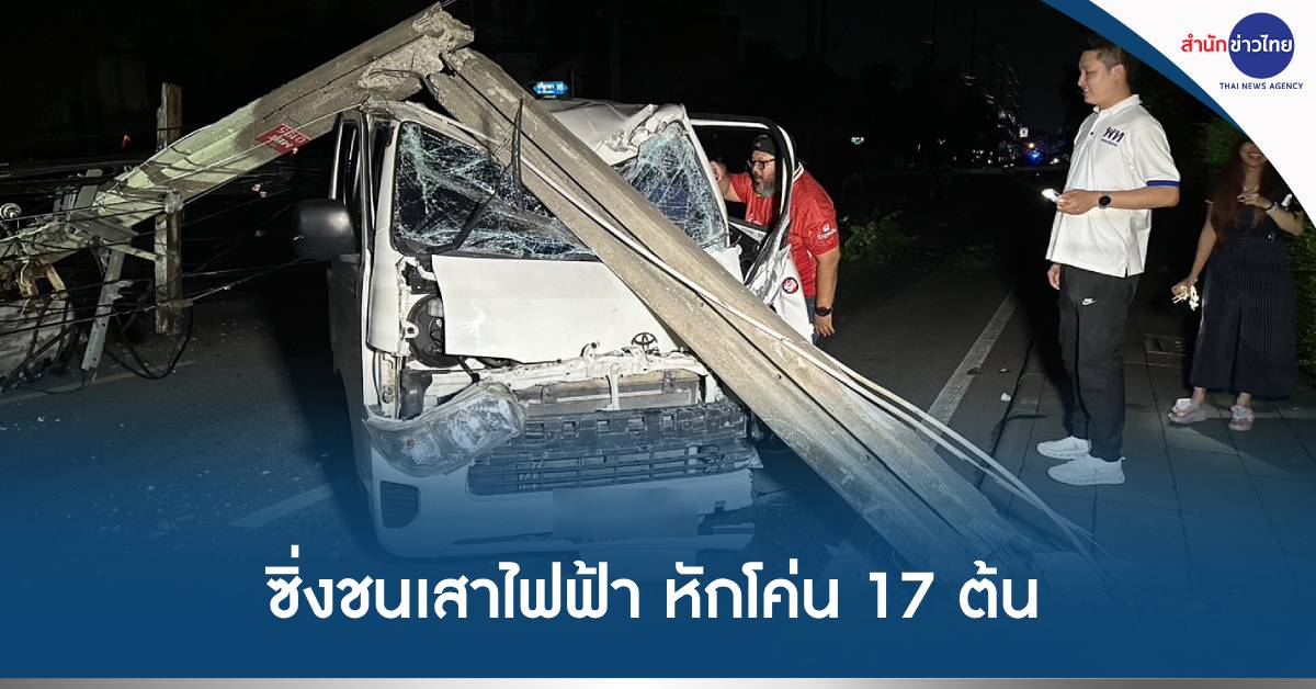 กทม. 6 ก.ค.-รถตู้ ซิ่งชนเสาไฟฟ้า หน้าปากซอยศรีบูรพา 16 ทำเสาไฟฟ้าหักโค่น 17 ต้น รถยนต์เสียหาย 5 คัน เจ็บ 8 คน ชาวบ้านเขตบางกะปิ กว่า 100 หลังคาเรือนไม่มีไฟฟ้าใช้