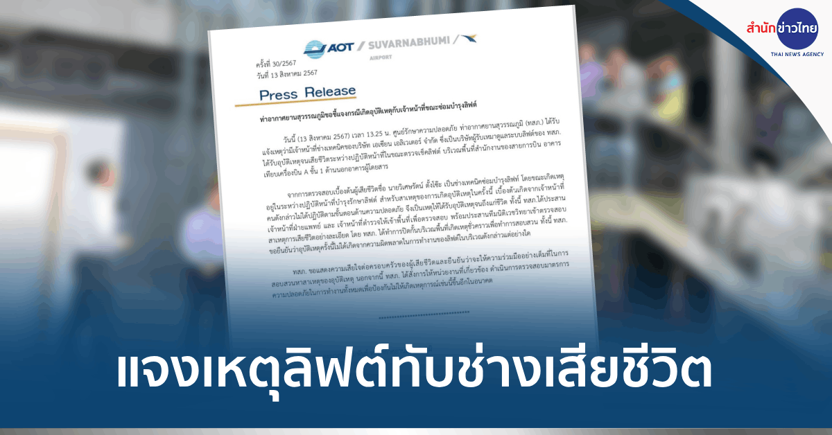 ล่าสุดท่าอากาศยานสุวรรณภูมิออกเอกสาร ชี้แจง ระบุเวลา 13.25 น. ศูนย์รักษาความปลอดภัย ท่าอากาศยานสุวรรณภูมิ ได้รับแจ้งเหตุว่ามีเจ้าหน้าที่ช่างเทคนิคของบริษัทผู้รับเหมาดูแลระบบลิฟต์ของสุวรรณภูมิ ได้รับอุบัติเหตุจนเสียชีวิตขณะปฏิบัติหน้าที่
