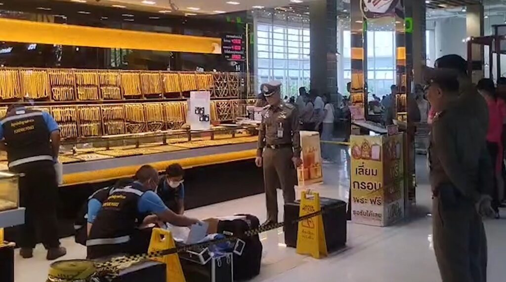 ด้าน ผกก.สน.ห้วยขวาง ให้ข้อมูลว่าก่อนเกิดเหตุคนร้ายมาเดินดูลาดเลาหน้าร้านแล้วเดินออกไปลักษณะเหมือนว่าชั่งใจจะก่อเหตุหรือไม่ จากนั้นกลับมาที่ร้านอีกครั้ง โดยยืนอยู่ข้างร้าน และขอพนักงานร้านดูสร้อยคอทองคำ ซึ่งมีลักษณะพิรุธ พนักงานจึงเรียกให้คนร้ายเข้ามาดูทองในร้าน โดยคนร้ายทำทีขอดูสร้อยข้อมือ 2 เส้น โดยเส้นแรกดูแล้วก็คืนให้พนักงาน แต่เส้นที่ 2 ปรากฏว่าระหว่างที่คนร้ายกำลังดูสร้อย พนักงานเห็นว่ามีลักษณะพิรุธ มือไม้สั่น ขณะนั้นคนร้ายสวมหมวก หน้ากากอนามัยปิดบังใบหน้าอยู่ จึงกำลังจะบอกให้ถอดหมวกและแมสก์ออกก่อน แต่ไม่ทัน คนร้ายคว้าสร้อยข้อมือทองคำ 5 บาท วิ่งออกไปจากร้านทันที ก่อนไปสะดุดทางต่างระดับทิ้งรองเท้าแตะเอาไว้ โดยมีพนักงานร้านทองวิ่งตามคนร้ายไป แต่เมื่อถึงบันไดเลื่อนชั้น 1 คนร้ายคว้าปืนหันมายิงพนักงานร้านถึง 2 ครั้ง ครั้งแรกแรกกระสุนด้าน และครั้งที่ 2 กระสุนลั่นลงพื้น จากนั้นวิ่งไปขึ้นรถจักรยานยนต์หลบหนีไปทันที