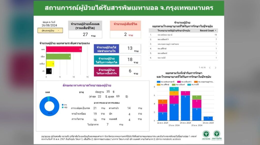 ความคืบหน้ากรณีพบผู้ป่วยและผู้เสียชีวิต ด้วยอาการ Methanol intoxication หรือภาวะพิษจากเมทานอล จากการดื่มสุราเถื่อนจากซุ้มยาดองย่านหทัยราษฎร์ เขตมีนบุรี โดยระหว่างวันที่ 22-25 ส.ค.ที่ผ่านมา มีผู้ป่วยเข้ารับการรักษา 21 คน เสียชีวิตแล้ว 1 คน และอาการวิกฤติอีก 1 คน ส่วนผู้ป่วยที่เหลือกระจายรักษาตัวในหลายโรงพยาบาล ส่วนใหญ่ใส่ท่อช่วยหายใจ