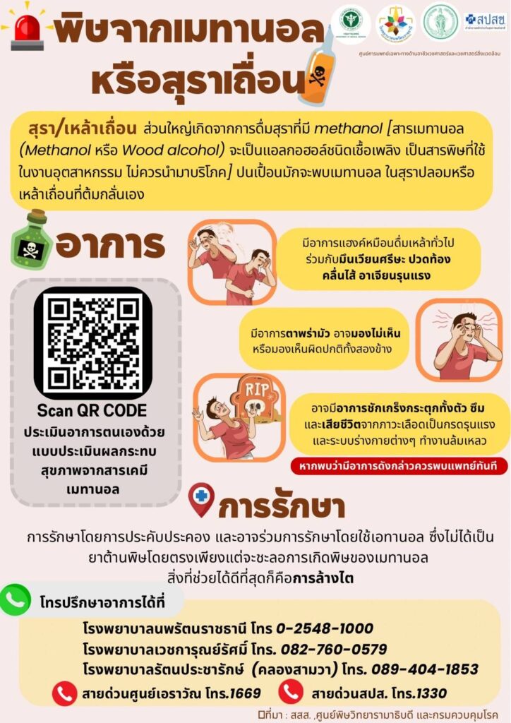 ทั้งนี้ ขอให้ประชาชนที่ดื่มเหล้าเถื่อนสังเกตอาการซึ่งแบ่งเป็น 3 ระดับ ดังนี้ ระดับ 1 ไม่มีอาการ : คำแนะนำ อยู่บ้านสังเกตอาการ ระดับ 2 มีอาการอ่อนเพลีย ปวดศีรษะ เวียนศีรษะ คลื่นไส้ อาเจียน : คำแนะนำ สังเกตอาการ หากอาการไม่ดีขึ้น ให้ไปสถานพยาบาลใกล้บ้านทันที ระดับ 3 มีอาการด้านการมองเห็นผิดปกติ เช่น เห็นภาพไม่ชัด การมองเห็นแตกต่างจากเดิม ตาพร่า ตามัว เห็นภาพขาวจ้า แพ้แสง สับสน มองเห็นสีผิดปกติ หอบ เหนื่อย หายใจเร็ว ชัก เกร็ง : คำแนะนำ รีบเดินทางมาห้องฉุกเฉินโรงพยาบาลใกล้บ้านทันที หรือโทร.1669 โดยสามารถประเมินอาการพิษจากเมทานอล จากลิ้งค์นี้ได้ https://shorturl.asia/ksFZb หรือโทรปรึกษาอาการได้ที่โรงพยาบาลนพรัตนราชธานี 0-2548-2300 โรงพยาบาลเวชการุณย์รัศมิ์ 08 2760 0579 โรงพยาบาลรัตนประชารักษ์ 08 9404 1853 สายด่วนศูนย์เอราวัณ 1669 สายด่วน สปสช. 1330