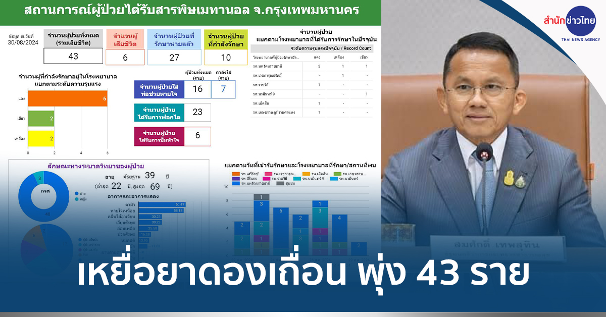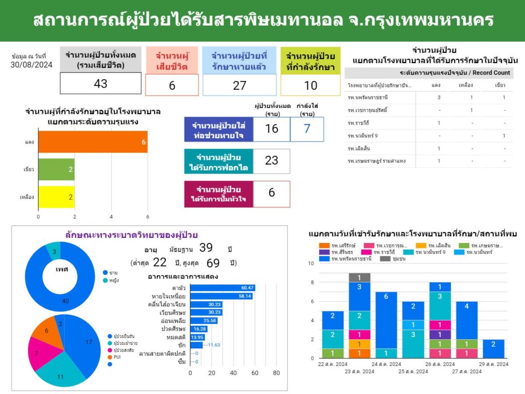 นายสมศักดิ์ เทพสุทิน รัฐมนตรีว่าการกระทรวงสาธารณสุข กล่าวว่า จากการรายงานสถานการณ์ผู้ป่วยหลายรายเข้าโรงพยาบาลพร้อมกัน เนื่องจากดื่มสุราเถื่อน โดยศูนย์ปฏิบัติการ ณ โรงพยาบาลนพรัตนราชธานี พบผู้ป่วยเริ่มเข้ารับการรักษาตัวในโรงพยาบาลต่างๆ ในกรุงเทพมหานคร ตั้งแต่วันที่ 22 สิงหาคม 2567 จนถึงขณะนี้ (วันที่ 30 สิงหาคม 2567) รวม 43 ราย มีผู้เสียชีวิต 6 ราย รักษาหายและกลับบ้านได้ 27 ราย ทั้งนี้ นับแต่เกิดเหตุการณ์ที่มีผู้ป่วยจำนวนมากจากการบริโภคสุราที่มีสารพิษเมทานอลเจือปน จึงได้สั่งการให้กรมการแพทย์ตั้งศูนย์ปฏิบัติการฉุกเฉินส่วนหน้าที่โรงพยาบาลนพรัตนราชธานี ดำเนินการแก้ปัญหาแบบบูรณาการร่วมกับกรมควบคุมโรค, กรมวิทยาศาสตร์การแพทย์, กองบังคับการตำรวจนครบาล 3, กรมสรรพสามิต และกรุงเทพมหานคร ทำให้สามารถควบคุมสถานการณ์ไม่ให้ลุกลาม ได้ภายใน 1 สัปดาห์ ด้วยความร่วมมือของทุกฝ่ายเร่งแก้ปัญหาและรักษาผู้ป่วย ลดการป่วยหนักและเสียชีวิต
